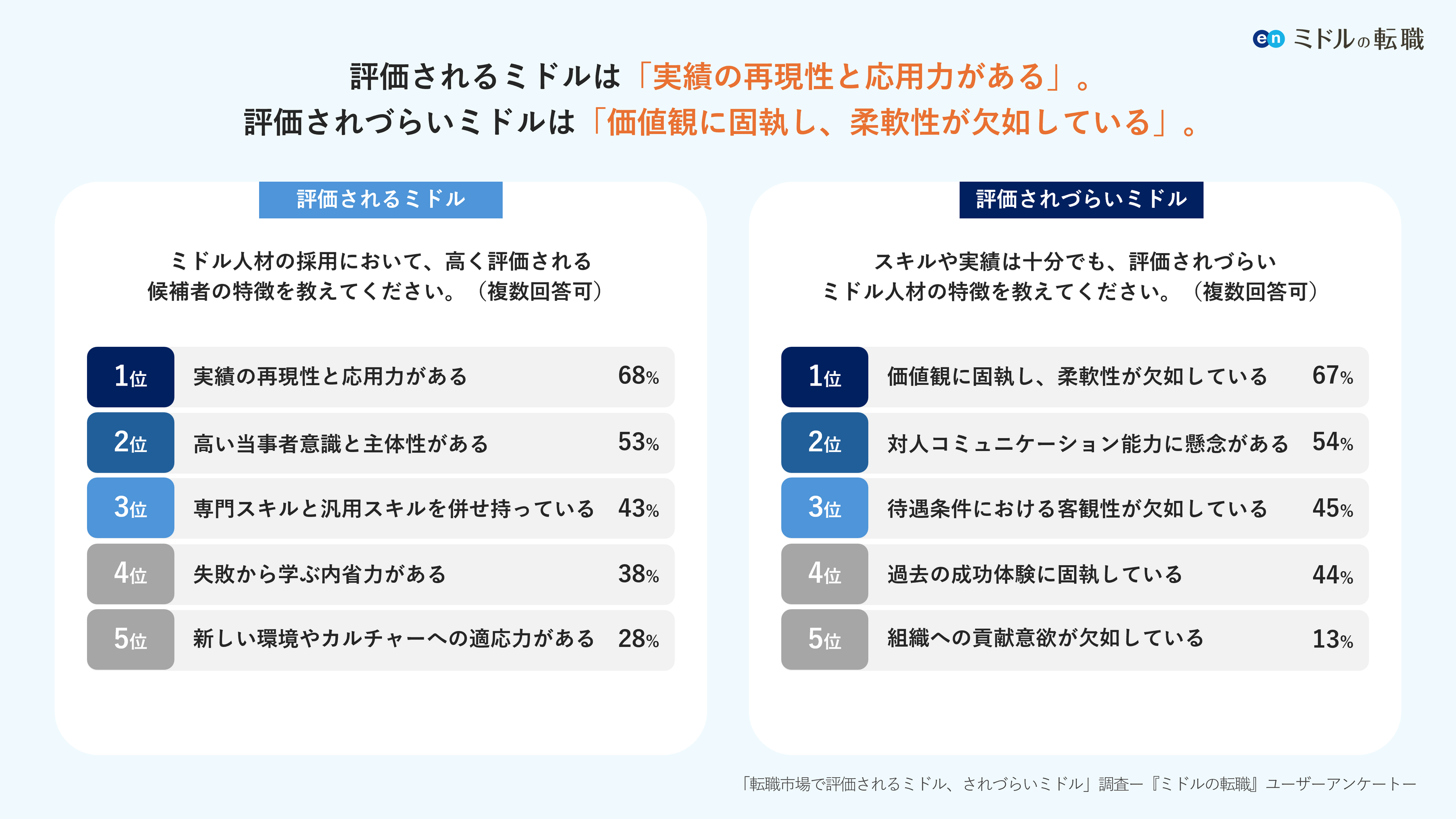 エン「転職市場で評価されるミドル、されづらいミドル」調査。評価されるミドルは「実績の再現性と応用力がある」。評価されづらいミドルは「価値観に固執し、柔軟性が欠如している」。
