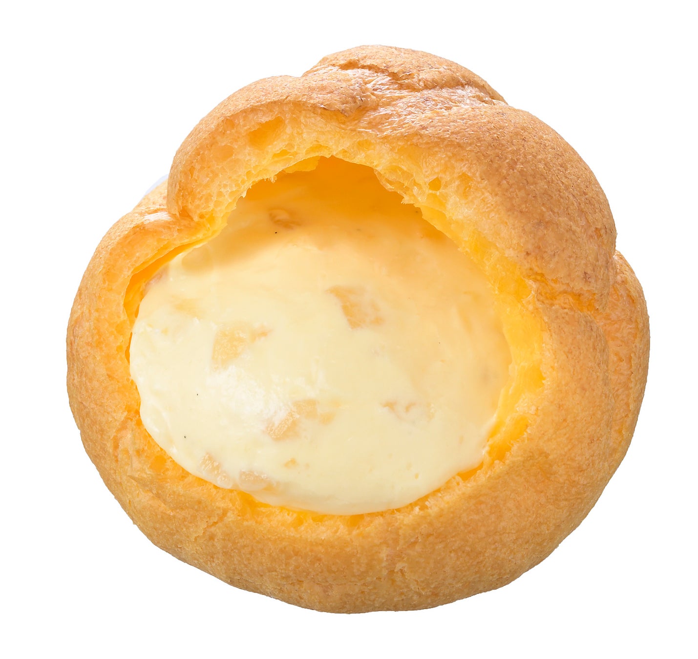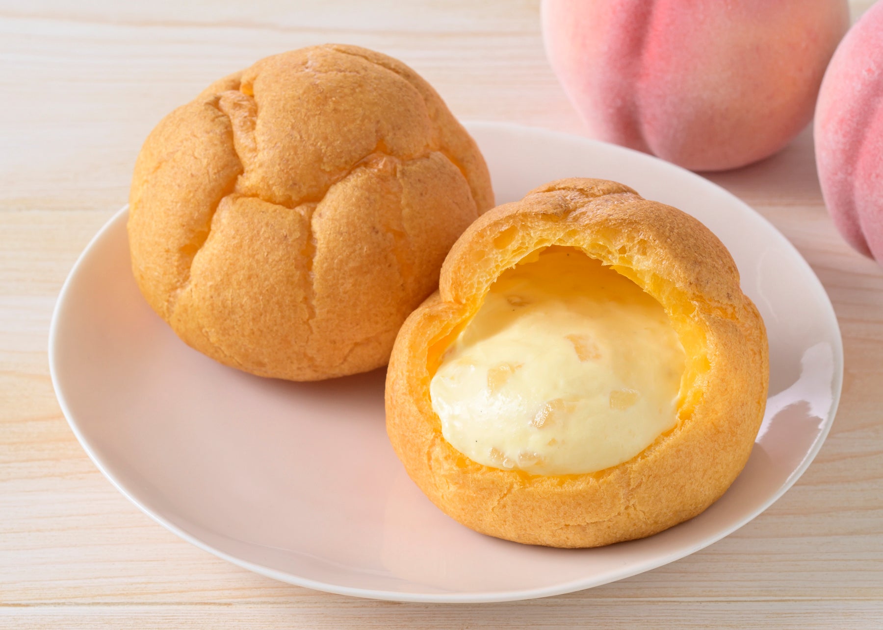 特長:白桃ダイスがたっぷり入った白桃カスタードを、風味豊かなシュー皮にたっぷり詰めました。白桃の果肉感やジューシーさ、フワッと広がる香りを楽しめるプレミアムなシュークリームです。