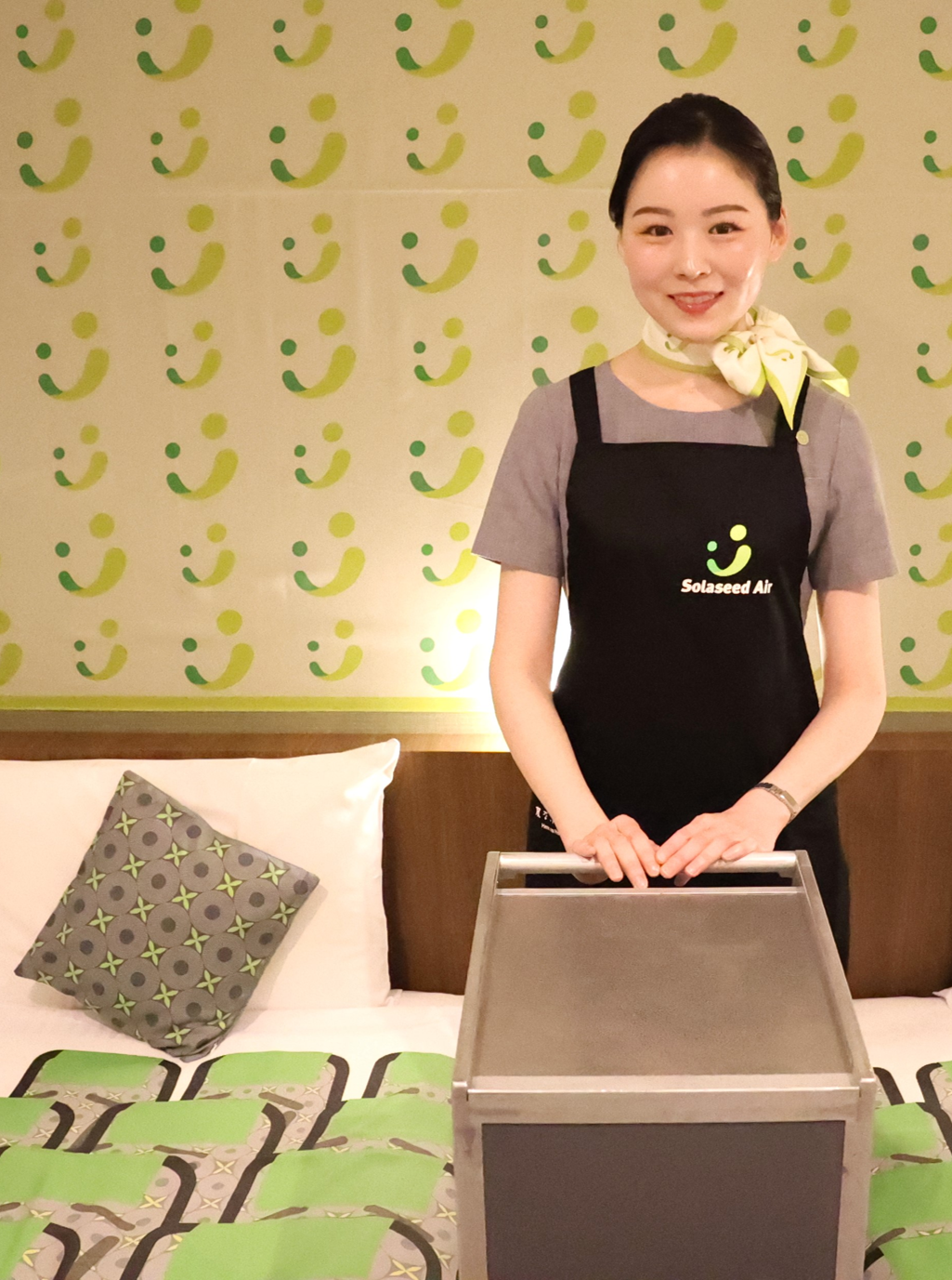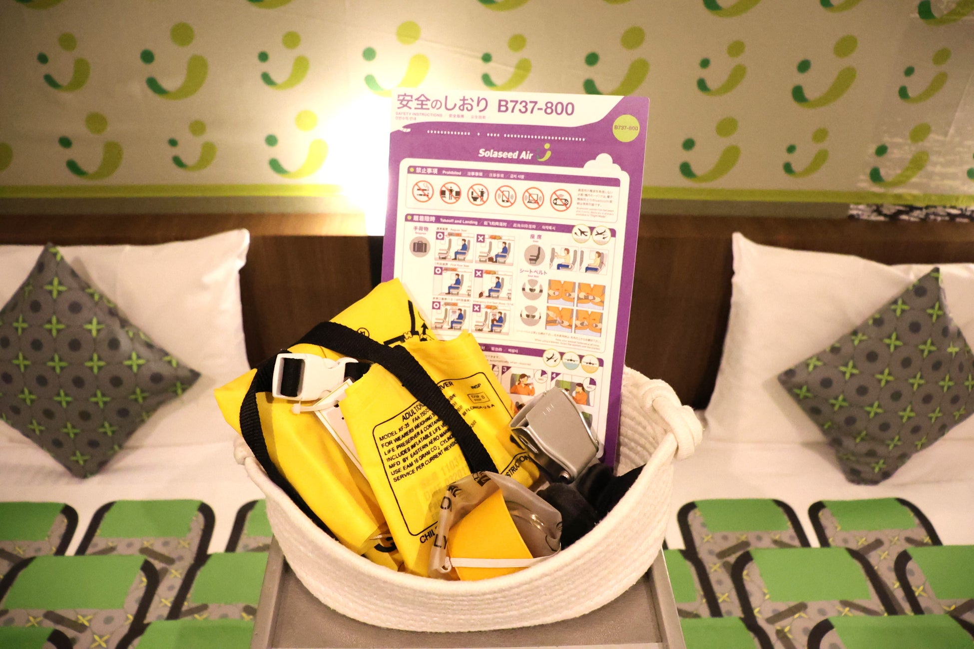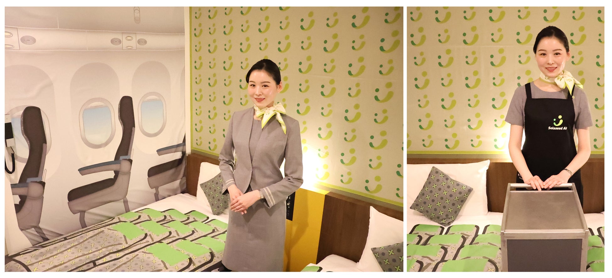 変なホテル東京 羽田と変なホテル鹿児島 天文館は、各ホテル2部屋限定で、ソラシドエアとホテルが初めてコラボレーションした「ソラシドエアコラボルーム」を2月14日(金)より発売します。「ソラシドエアコラボルーム」は、ソラシドエアの機内をイメージして、壁・カーテン・ベッドカバーをデザインしました。客室にお入りいただいた際に、機内アナウンスを模したウエルカムメッセージ動画でお出迎えします。また、実際にソラシドエアの機内で使用されているサービスカート、ライフベスト・シートベルト・酸素マスク・安全のしおりのセーフティーデモンストレーションキット、クッションとブランケット、機内誌「ソラタネ」、紙コップ、ソラシドエアオリジナルのアゴユズスープを設置しており、機内の雰囲気をさらに演出しています。さらに、お持ち帰りいただける、変なホテルxソラシドエアオリジナルデザインの、客室乗務員の制服のスカーフと、機内サービス時に着用するサービスエプロンをご用意しておりますので、客室内で「キャビンアテンダントなりきり体験」をお楽しみいただけます。ご宿泊のお客様には、非売品のポストカード、ボールペン、ソラシドスマイルクラブのステッカーなどのお土産付きです。価格は朝食付き21,300円~、素泊まり19,800円~(いずれも1泊、1部屋、税サ込)、宿泊は3月1日(土)より