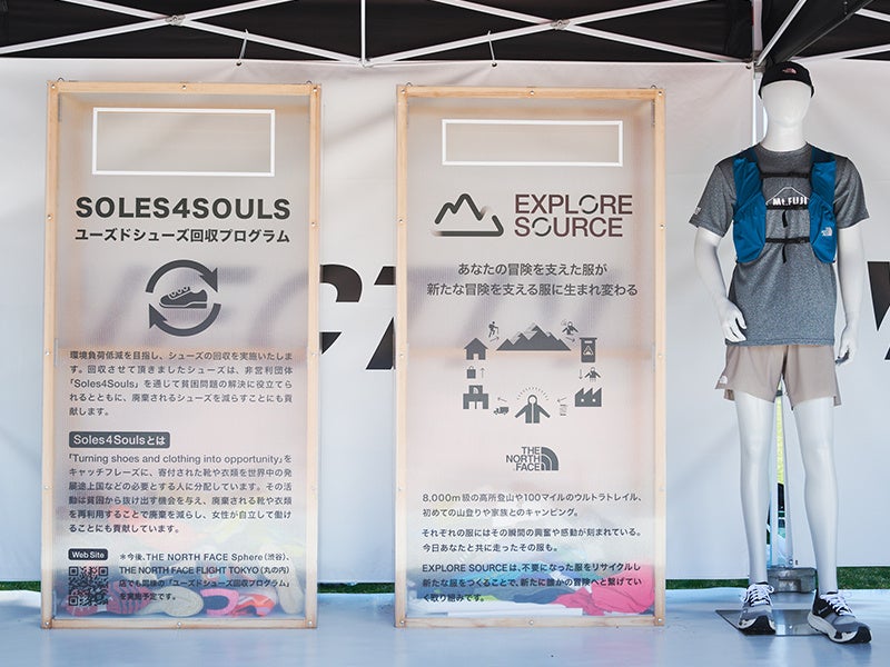 今回も株式会社JEPLAN、Mt.FUJI100実行委員会とのパートナーシップにより、Mt.FUJI100 2025の会場内に設置される特設ブースで不用になったウエア、シューズの回収を実施します。また、ザ・ノース・フェイスでは、独自の循環型アップサイクルプロジェクトである「EXPLORE SOURCE(エクスプロールソース)」によって、役割を終えた製品を新たな製品に生まれ変わらせる、地球環境改善、循環型社会実現に向けた取り組みをスポーツイベントを通じて実施しており、その繊維を参加賞Tシャツに採用しています。