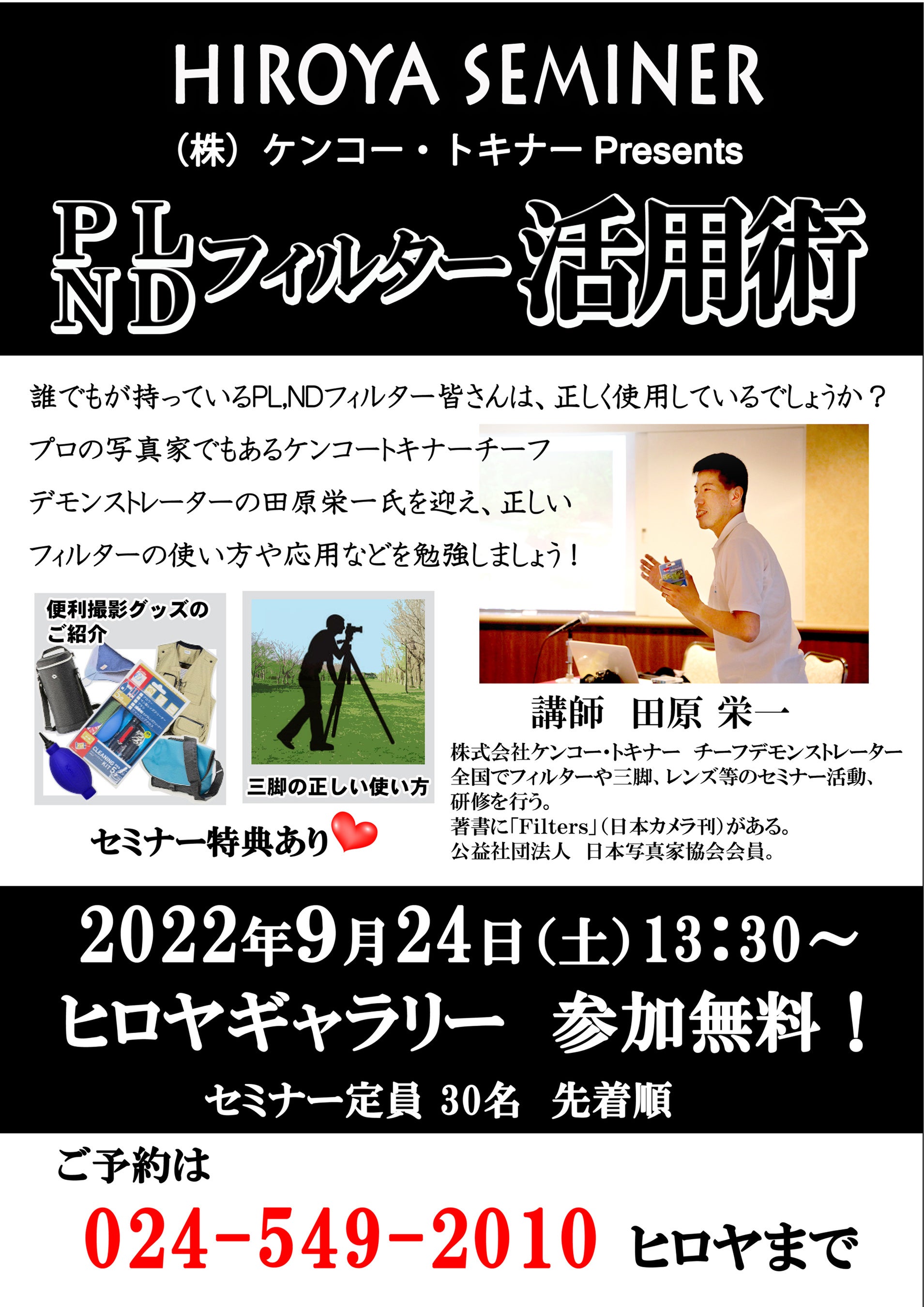 、福島県福島市の「ヒロヤ」にて、フィルターや三脚、写真用品のセミナーを行います。