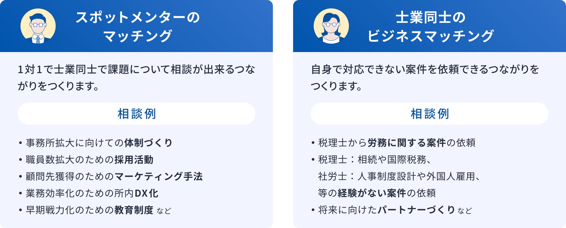 「スポットメンターのマッチング」は、事務所経営における採用や営業、事務所の業務効率化などの課題を抱えている士業が、知見を持つ士業に相談することができます。1回のスポットで、1対1でアドバイスを受けることが可能です。「士業同士のビジネスマッチング」は、専門外領域の案件が発生した際や、事務所でのリソース不足の際に、同業の事務所または、他業種の士業に案件を依頼することができます。継続的に案件を依頼する、長期的なビジネスパートナーを探すことも可能です。