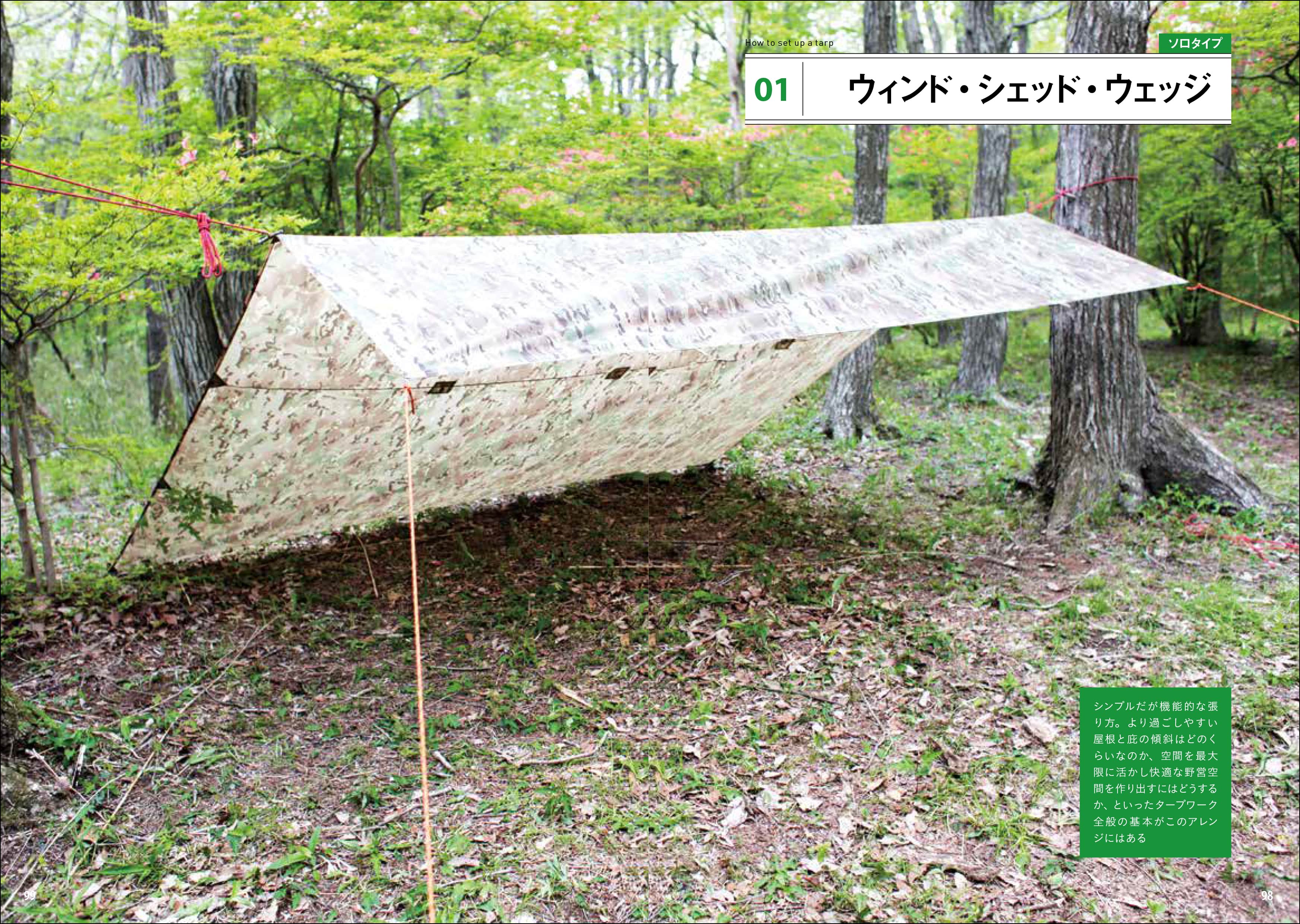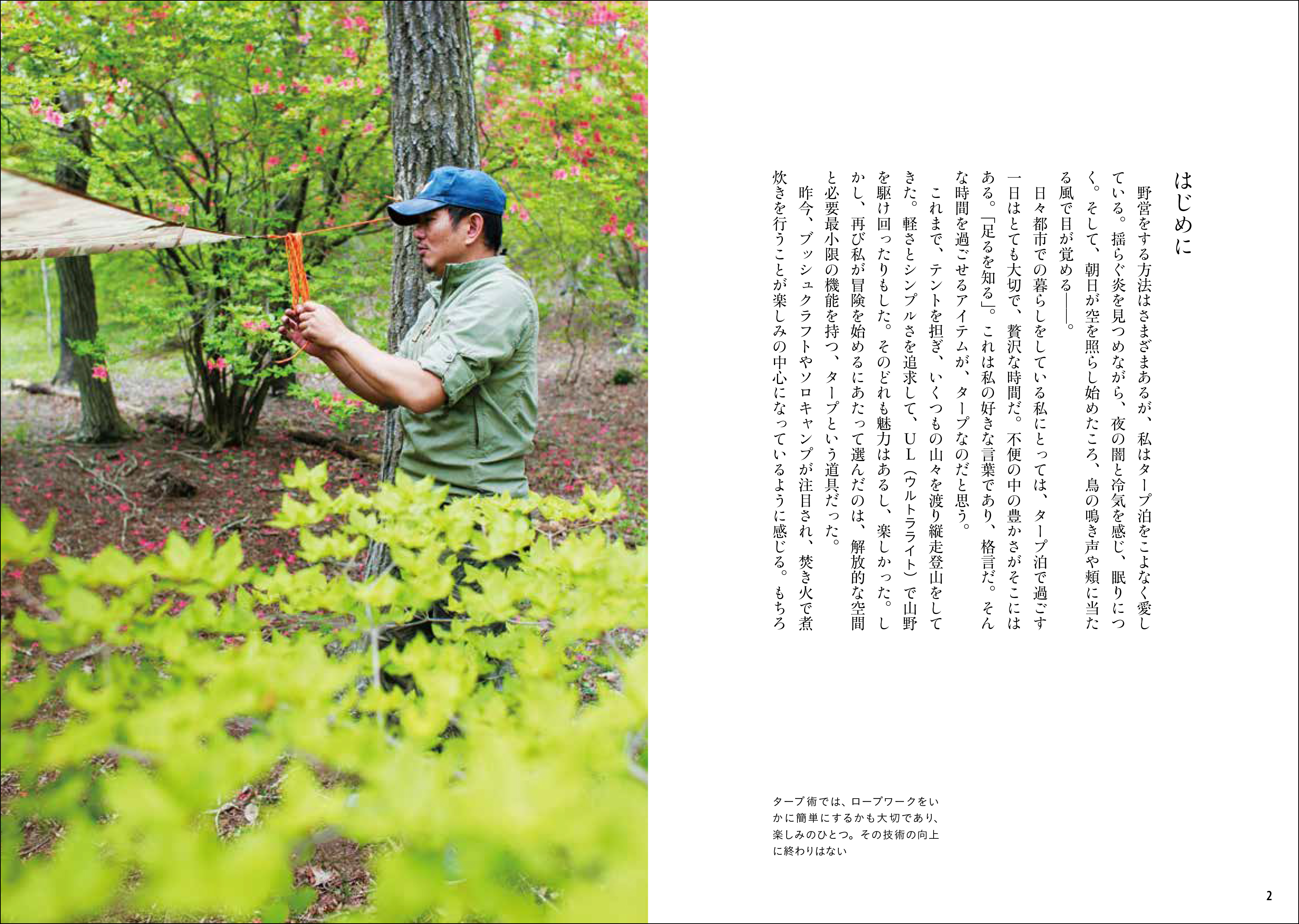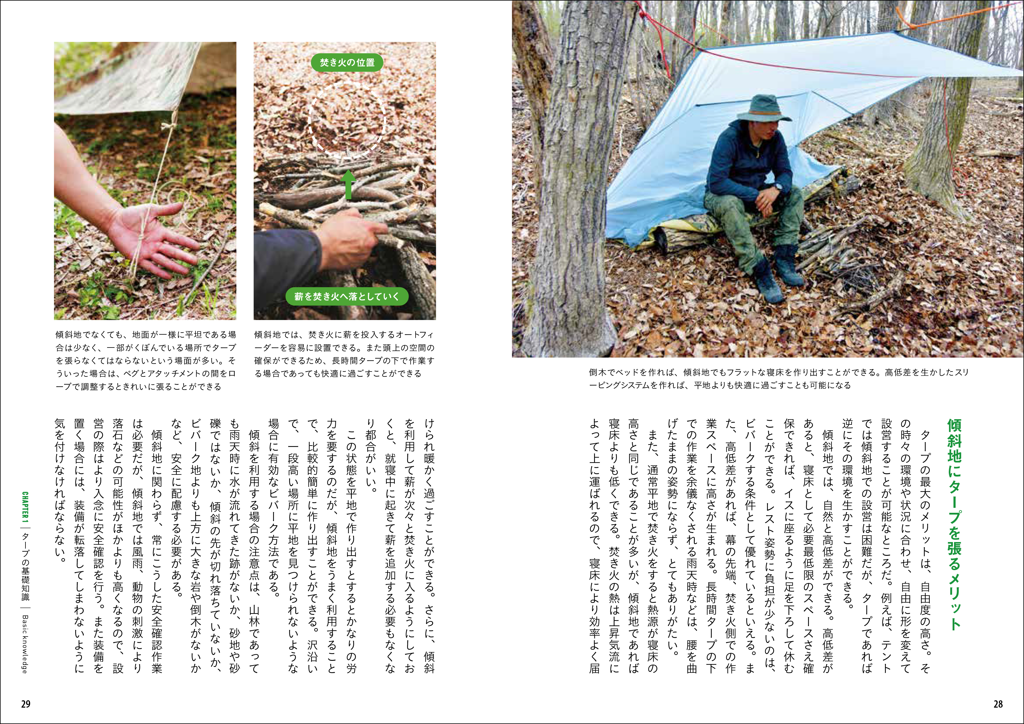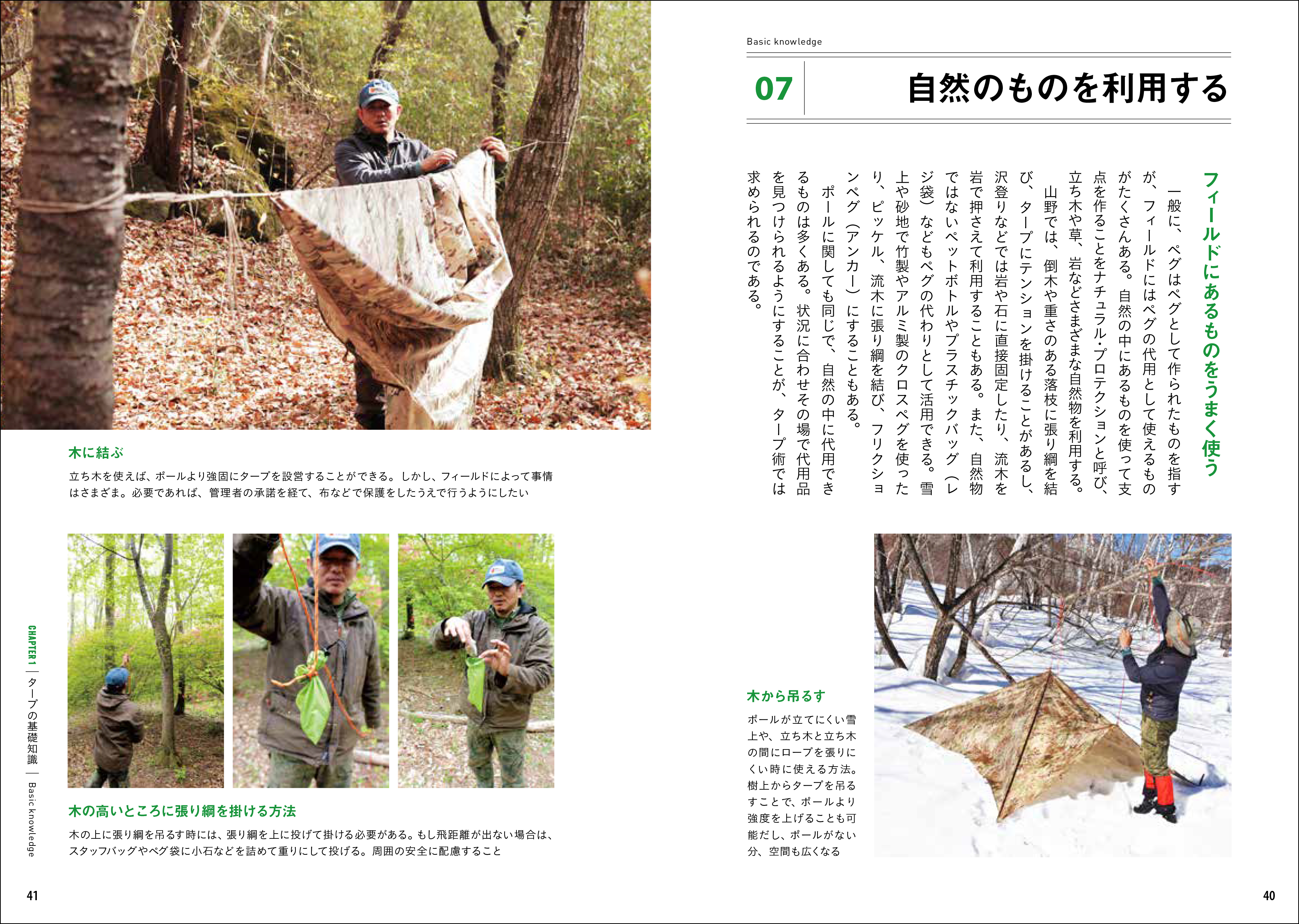 本書は、そんなさまざまな目的に合わせたタープの設置方法を紹介します。タープワークは、キャンプというアクティビティだけでなく、被災時・遭難時などの命に関わる場合の緊急シェルターとしても非常に役立つスキルです。