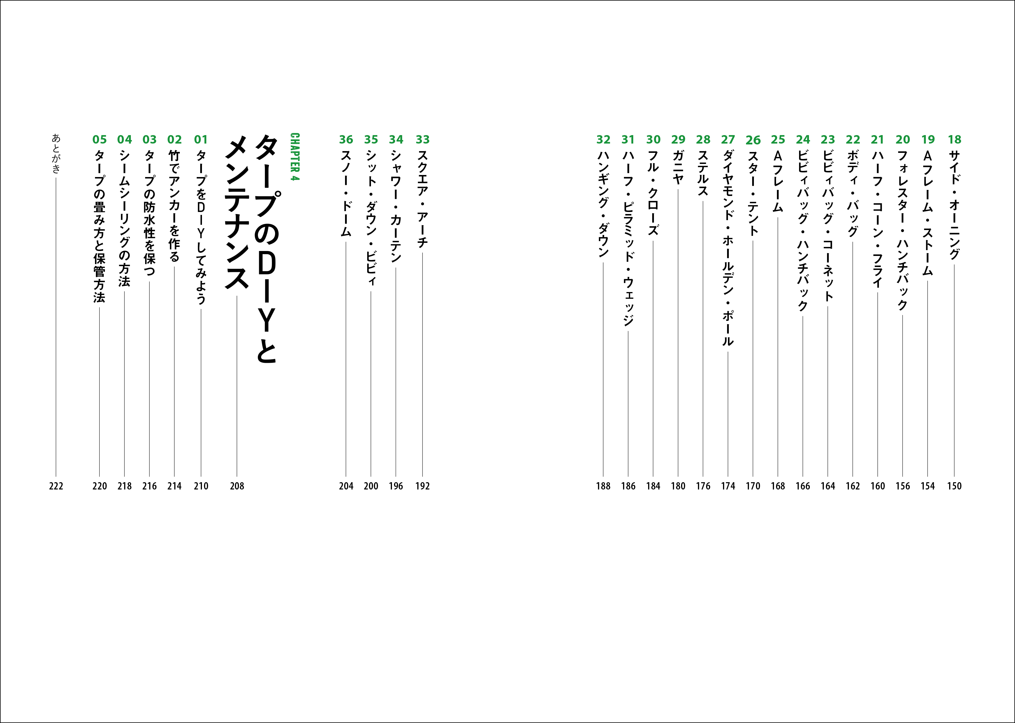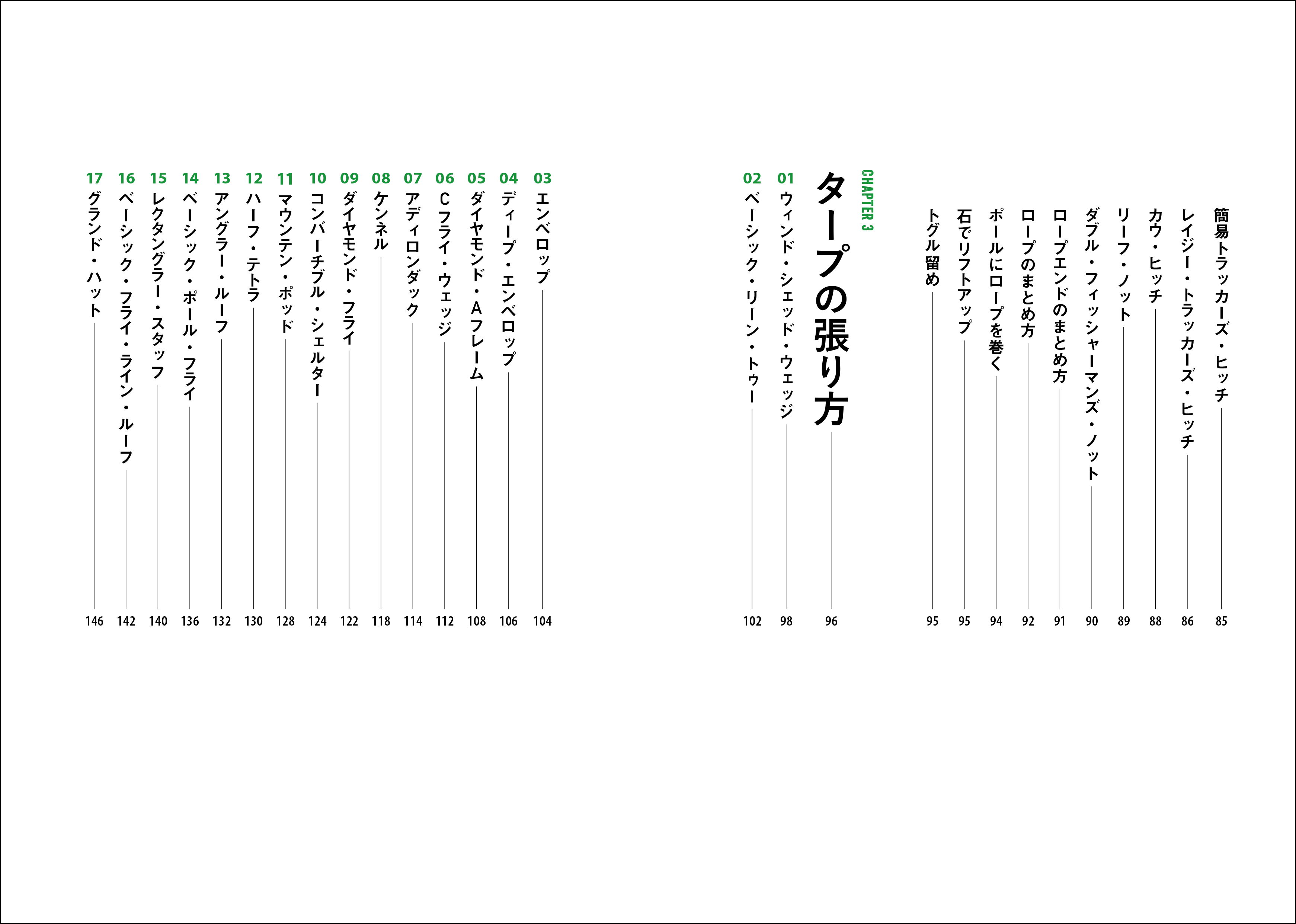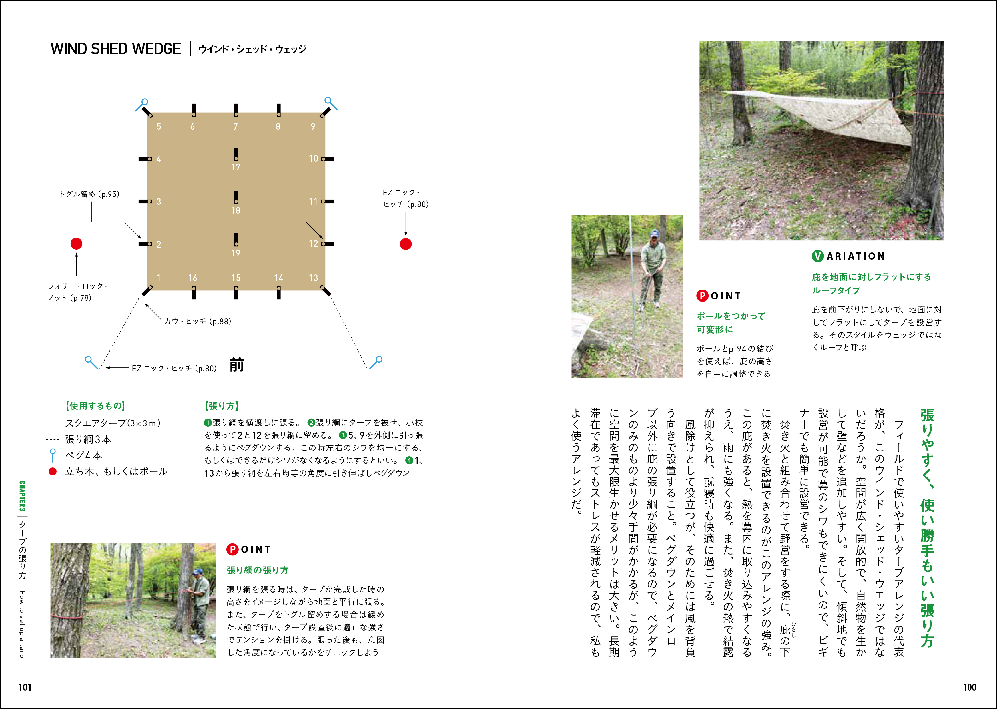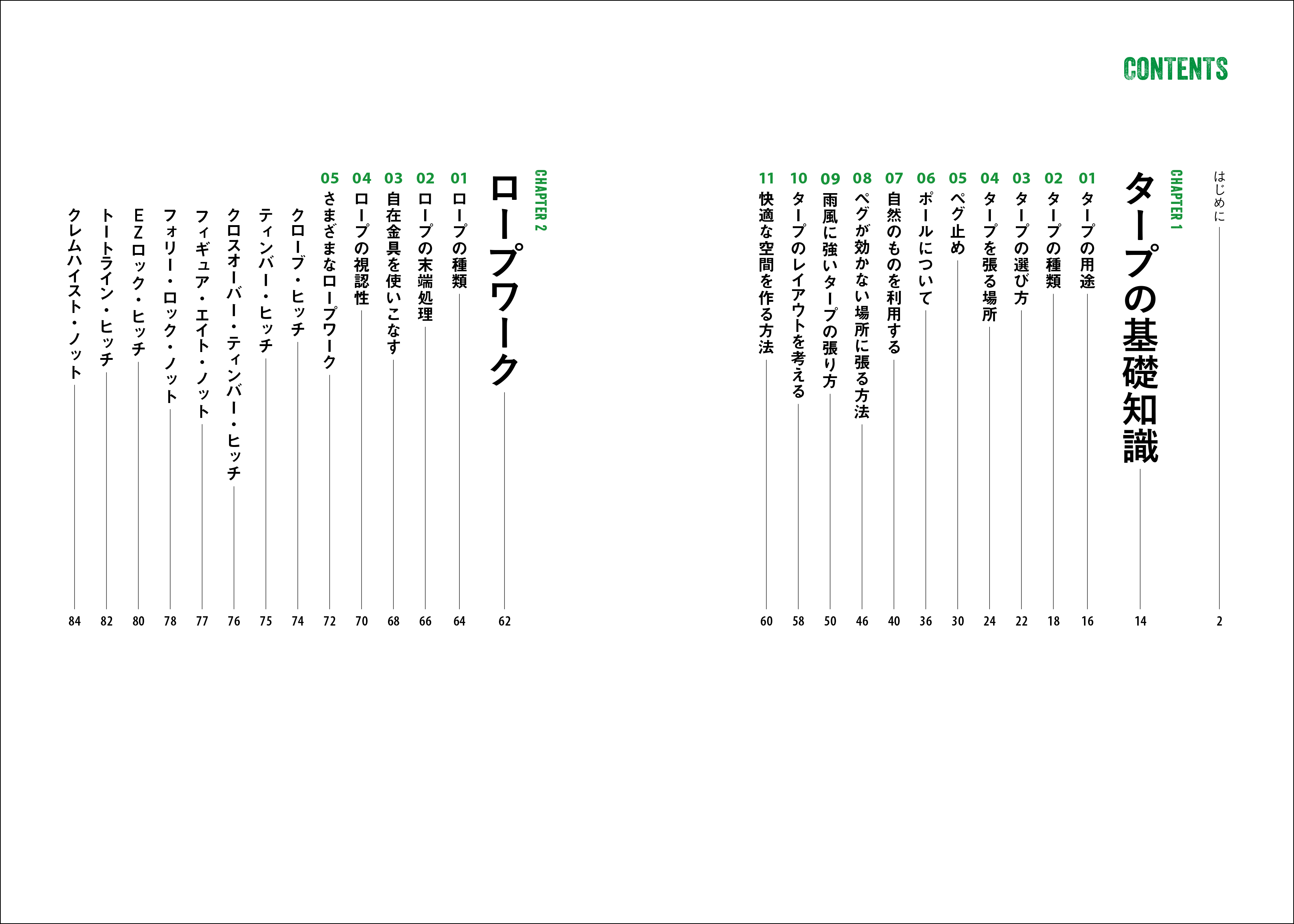 本書は、そんなさまざまな目的に合わせたタープの設置方法を紹介します。タープワークは、キャンプというアクティビティだけでなく、被災時・遭難時などの命に関わる場合の緊急シェルターとしても非常に役立つスキルです。