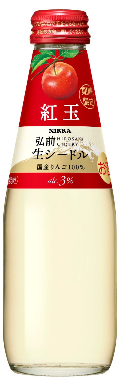 『ニッカ弘前 生シードル 紅玉リンゴ』は、生産量が少なく希少品種である紅玉リンゴを使用したアルコール3%のスパークリングワインです。紅玉リンゴの酸の効いた味と爽やかな香りを生かした甘酸っぱい味わいが特長です。パッケージは、表皮が真っ赤な紅玉リンゴをイメージした赤のラベルにリンゴのイラストと“紅玉”の文字を大きく記載することで、商品の特長を分かりやすく訴求しています。