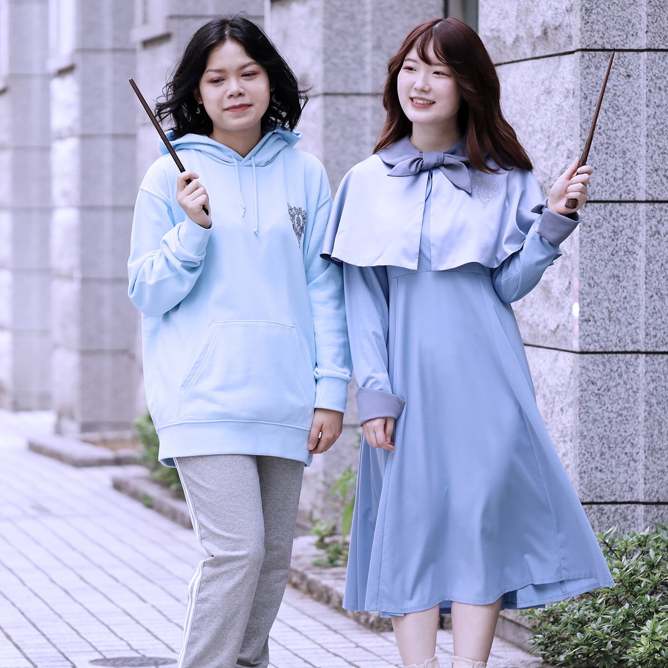 ヨーロッパのピレネー山脈のどこかにあると言われている魔法学校、「ボーバトン魔法アカデミー」。作中ではトライウィザード・トーナメント(三大魔法学校対抗試合)に出場するフラー・デラクールたちが通う魔法学校で、ボーバトン生は印象的な水色の制服を着用しています。そんなボーバトン生の制服をイメージし、ワンピース、ケープ 、ビッグパーカーの全3種のラインアップが登場いたします。ワンピースは、胸元に「ボーバトン魔法アカデミー」の校章の刺しゅうが施された、アイスブルーの色味が大人かわいい一着です。背面にはリボンが付属しており、サイズ調節も可能です。触り心地のよいサテン生地のケープは、ワンピースの上から羽織ってご使用いただけます。また、「ボーバトン魔法アカデミー」の運動着をイメージしたビッグパーカーは、英字で「BEAUXBATONS」とデザインされています。どなたでも着用いただける大きめのフリーサイズで、運動やお出かけ時以外にも部屋着としてもご使用いただけます。