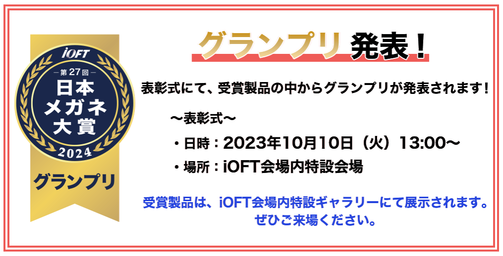 栄えあるグランプリは、2023年10月10日(火)13時~ 「第36回 国際 メガネ展 -iOFT-」展示会場内にて発表・表彰されます。