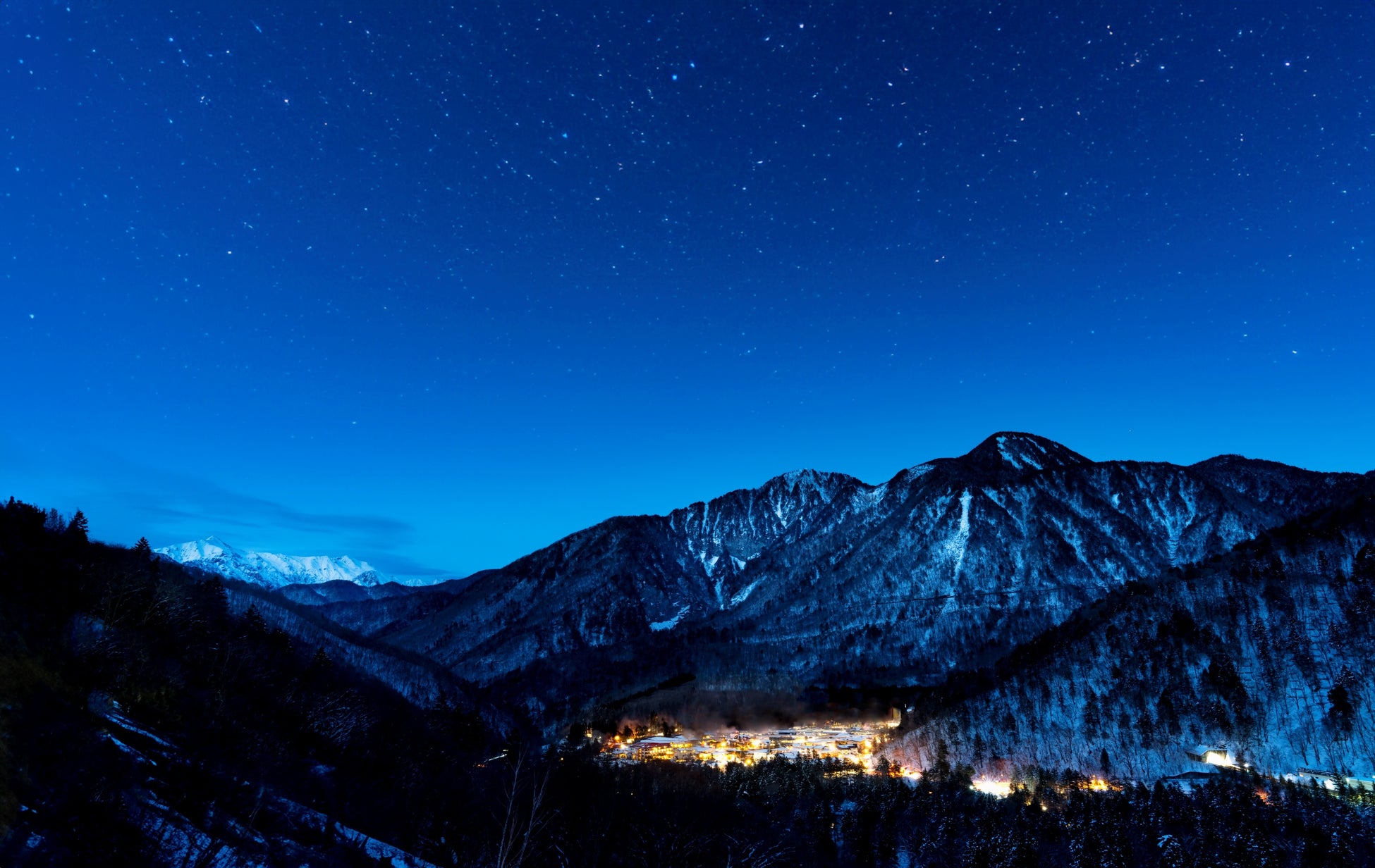 界 奥飛騨が位置する奥飛騨温泉郷は、日本有数の山々がそびえる北アルプスの麓に位置しています。高い山々に囲まれた土地は、とくに冬の間、早くに日没を迎えると、あたり一面は一気にひっそりとした静寂の世界に包まれます。そんな世界に、飛騨地域の文化や技術を取り入れた明かりが灯ります。山と森に囲まれて育まれた文化や技術が、冷たい空気の中で見る人の心にじんわりと伝わって、そのあかりの元を辿りたくなる、そんな空間を提案します。
