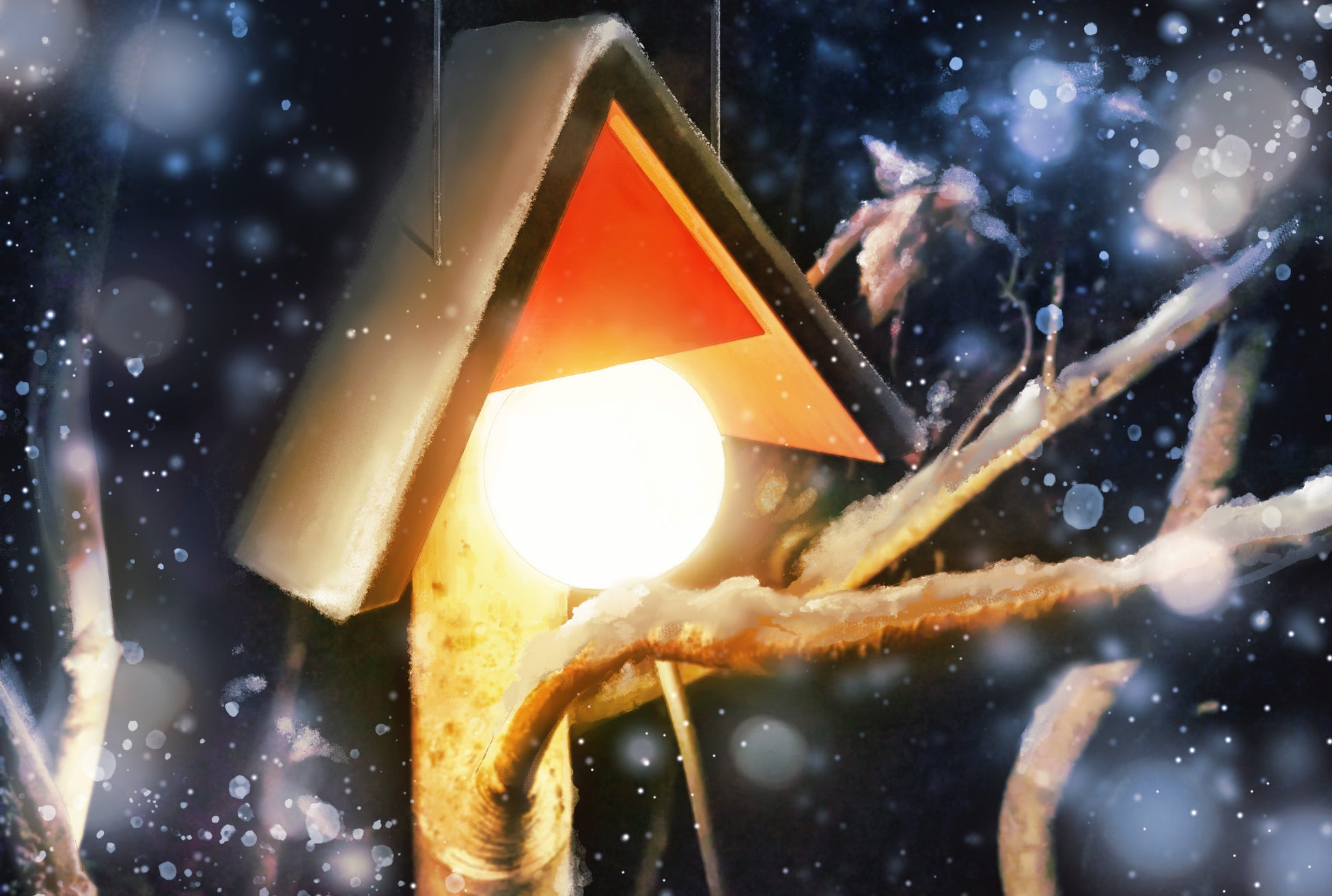 中庭を照らす照明は、この地域の風景や特有文化からヒントを得たオリジナルデザインの和照明「飛騨玉」。奥飛騨の冬の美しさを引き立てるアイテムとして誕生しました。ポイントは、電球の傘部分の形状が三角になっているところ。このデザインには、山の輪郭としての三角と、豪雪エリアならではの合掌造りを思わせる茅ぶき屋根の形の両方の意味を持たせています。また、三角の傘の内側にほどこされた「紅色」は、日本三大美祭りとして名高い「高山祭」や、地元の伝統工芸「飛騨春慶」、お土産として人気の「さるぼぼ」でもよく使用される色です。宿が位置する高山市は、面積の92%を山林が占め、山林資源の保有では日本トップクラスです。そんな山々と雪深さ、そして文化からインスピレーションを受けたデザインです。古くから受け継がれた温泉街の夜の情緒に、溶け込みつつ、新たな見どころとしてほんのり輝きます。