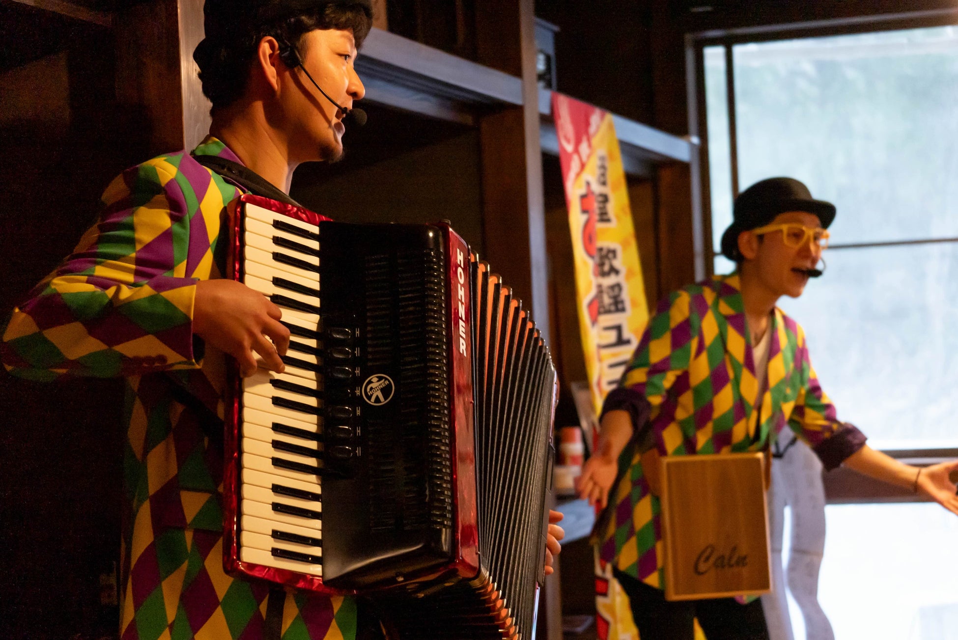 毎月第1日曜日に玉川温泉で「男性浴室ライブ」と「館内ライブ」を行っています。アコーディオンの軽快な音色と歌声に合わせて、観客全員で踊ったり歌ったり、みんなで一緒に楽しく参加できるライブが魅力の2人組です。