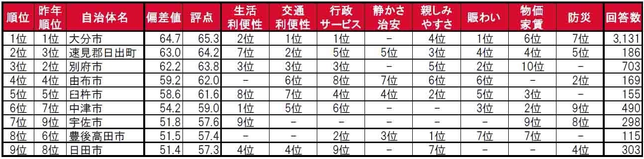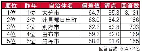 トップ5には、大分市と、大分市周辺に位置する街が今年も上位に並ぶ結果となっています。