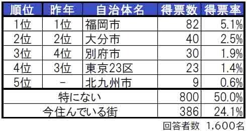 福岡市が、5.1%の高い得票率で4年連続で1位に輝きました。2位も4年連続で大分市、3位は昨年より順位を上げた別府市です。5位には、北九州市が新たにランクインしています。