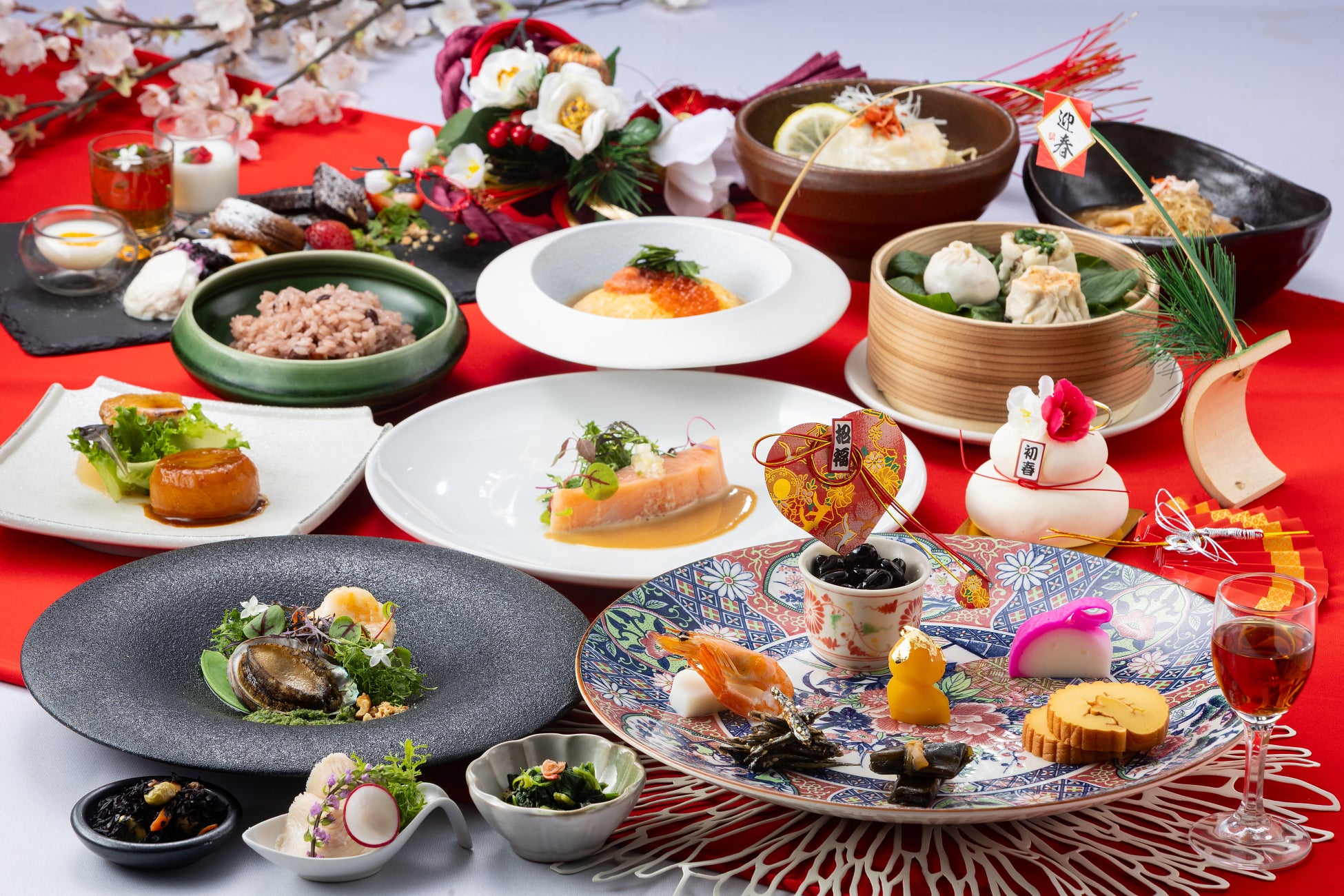 ブッフェ台には黒豆や伊達巻、「鶏肉と根菜の雑煮」などお正月をイメージした日本料理から「鱶鰭蒸し餃子」や「広東風焼売」などPrecious ONO HAKATAの創作中華まで、種類豊富なお料理が並びます。また朝食には紅ズワイ蟹や博多明太子を使用した玉子料理や「鯛蒸しと海老雲吞の中華そば」、ランチでは「根菜サラダと黒酢角煮酢豚」や「鯛と帆立のカルパッチョ」と、異なるラインナップからメイン料理をお選びいただけます。お好みのお料理をぜひお楽しみください。