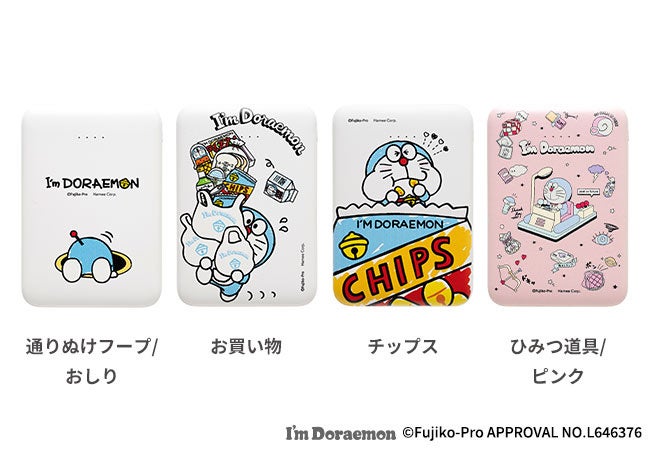 「アイムドラえもん」から、「お買い物」、「チップス」、「ひみつ道具/ピンク」、「通りぬけフープ/おしり」の4デザインを展開します。