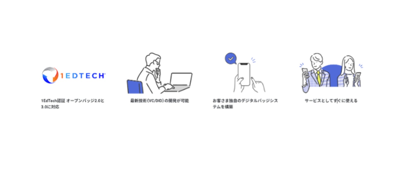 「デジタルバッジを発行したい」「デジタルバッジでスキル・資格を管理したい」「デジタルバッジを活用したソリューション開発を実現したい」など、全てのニーズに応えるトータルソリューションを提供しています。