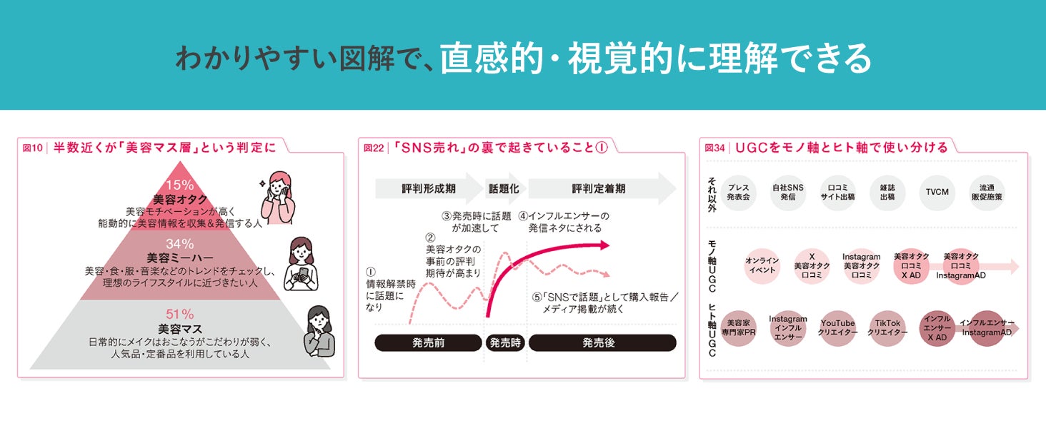 本書では、分かりやすい図をたくさん交えながら、バズコスメの仕組みや、実際に戦略を立てるために必要なことなどを解説しています。