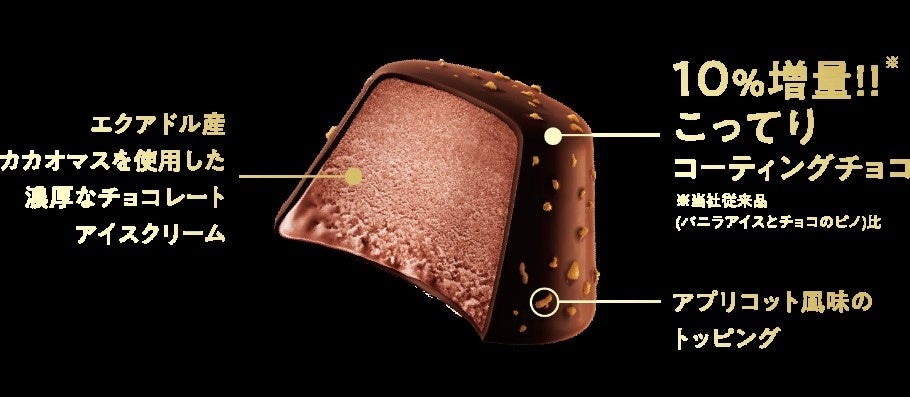 通常の「ピノ」よりもコーティングチョコを10%増量※し、ザッハトルテのコーティングチョコのあの“はしっこ”をイメージして“こってり”とさせました。そこに、エクアドル産カカオマスを使用したねっとりとした食感のチョコレートアイスクリームと、コーティングチョコに混ぜ込んだ軽快な食感のアプリコット風味トッピングがあいまって、ザッハトルテの再現性を高めています。