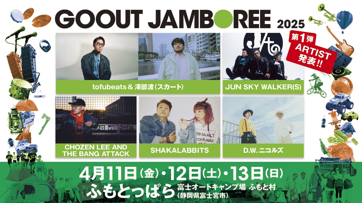 アウトドアファッション雑誌「GO OUT」が主催する、キャンプ初心者から、ソロ、カップル、ファミリー、グループまで、誰もが楽しめるキャンプと音楽のフェスティバル 「GO OUT JAMBOREE 2025」が、2025年4月11日(金)〜13日(日)の3日間、ふもとっぱら(静岡県富士宮市) にて開催。