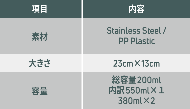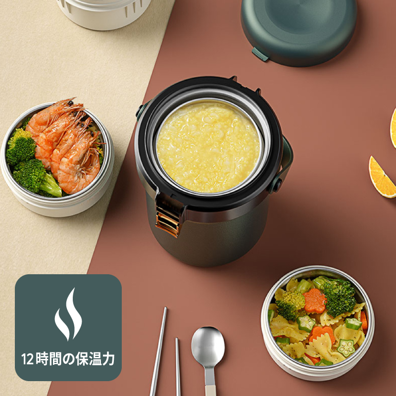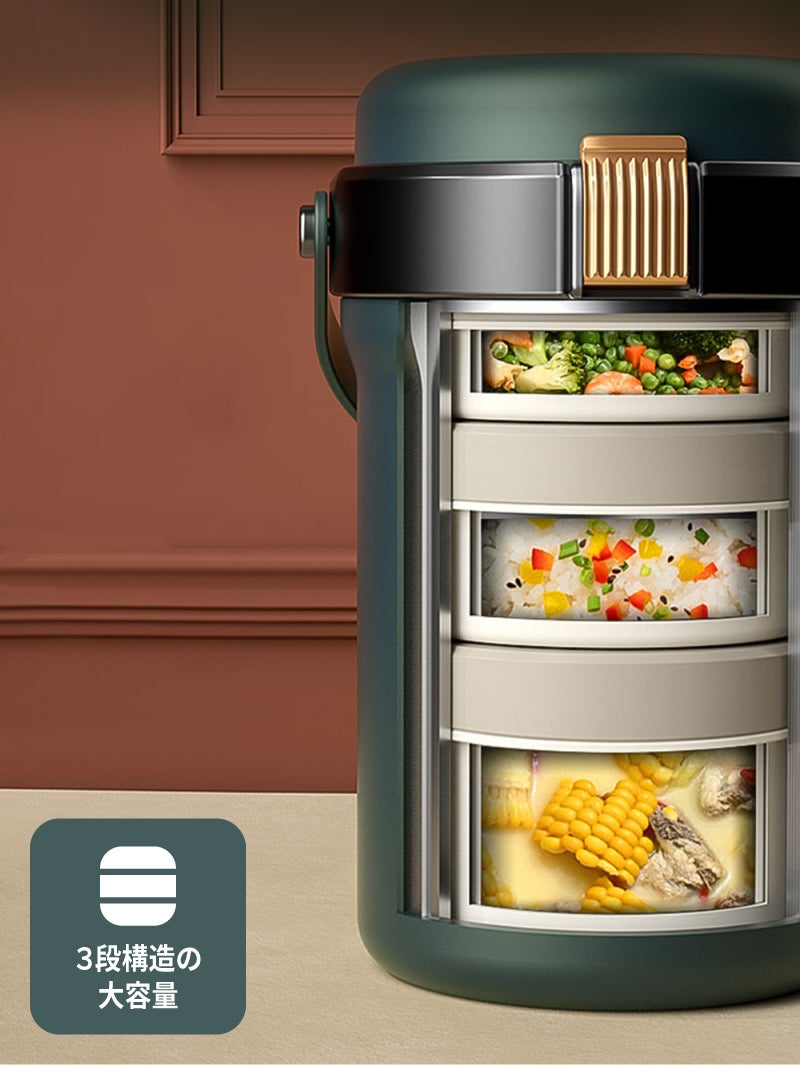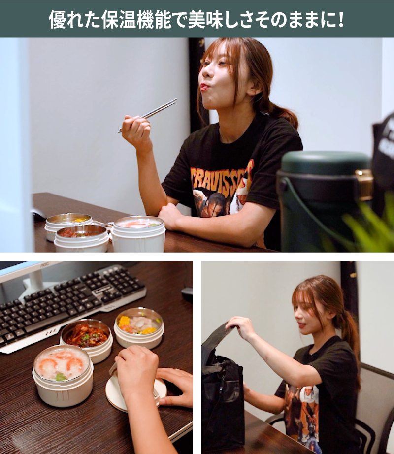使用する段数が決められるので、食欲がある日はスープ・ご飯・おかずの3層で合計2000mlの大容量、少なめで良い日は1段だけで380mlといったように、気分に合わせて使い分けることも可能です。