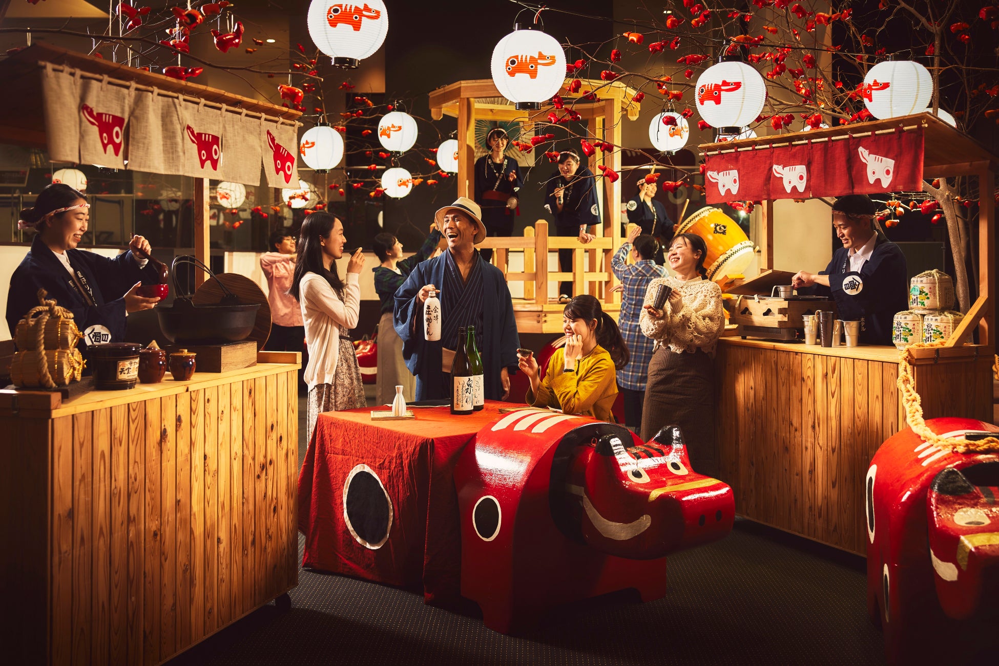 赤べこの日である11月3日を含む3連休には、赤べこの日をさらに祝うために、赤べこ柄のオリジナルこも樽で鏡開きを行います。お祝いの振る舞い酒として、会津の地酒をゲストの皆様にふるまいます。