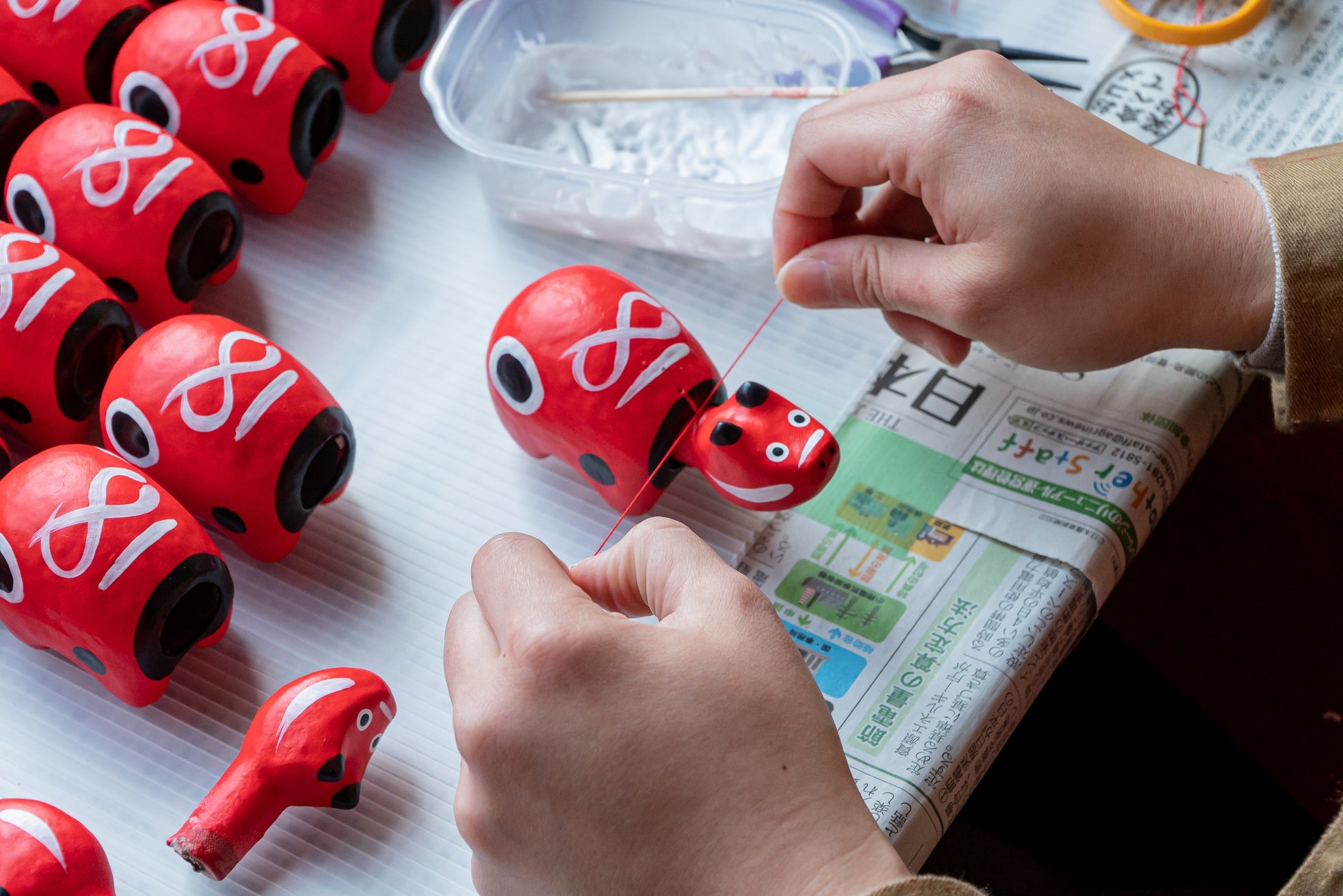 赤べこの特徴の一つは、ゆらゆらと首を揺らす愛らしい姿です。重りを付けた首を、胴体に手作業でバランスをとりながら付けることで、このゆらゆらとした動きを生みます。赤べこ作り体験では、伊藤氏のレクチャーのもと、「首つけ」と「絵付け」の2つの行程を体験できます。
