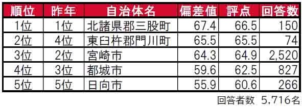 ○東臼杵郡門川町が昨年4位から順位を上げ2位