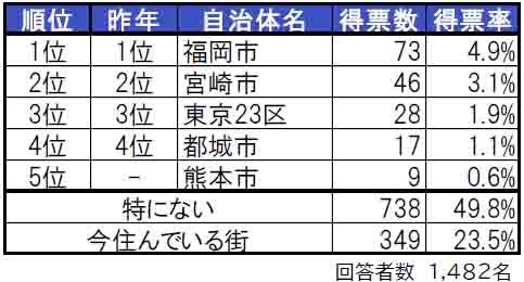 住みたい街は2年連続で、1位福岡市、2位宮崎市。3位は3年連続で東京23区。