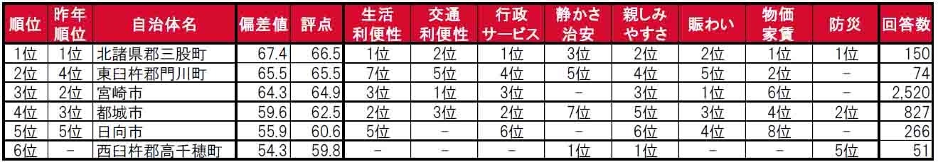 街の住みここちランキング2024<宮崎県版>自治体TOP6 因子別順位