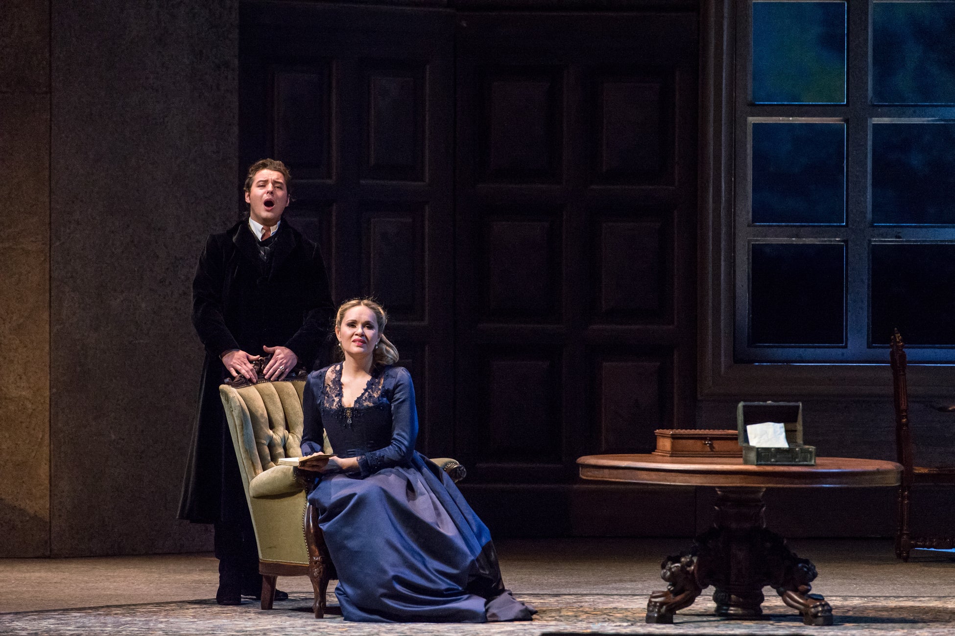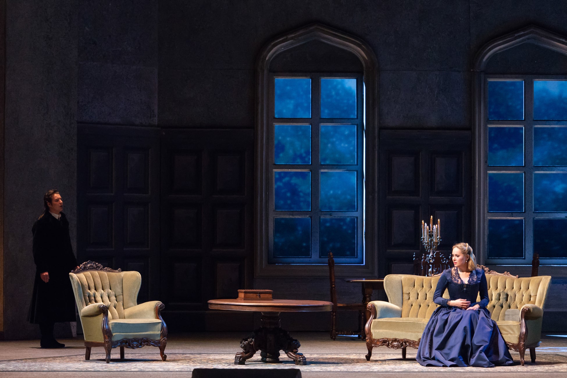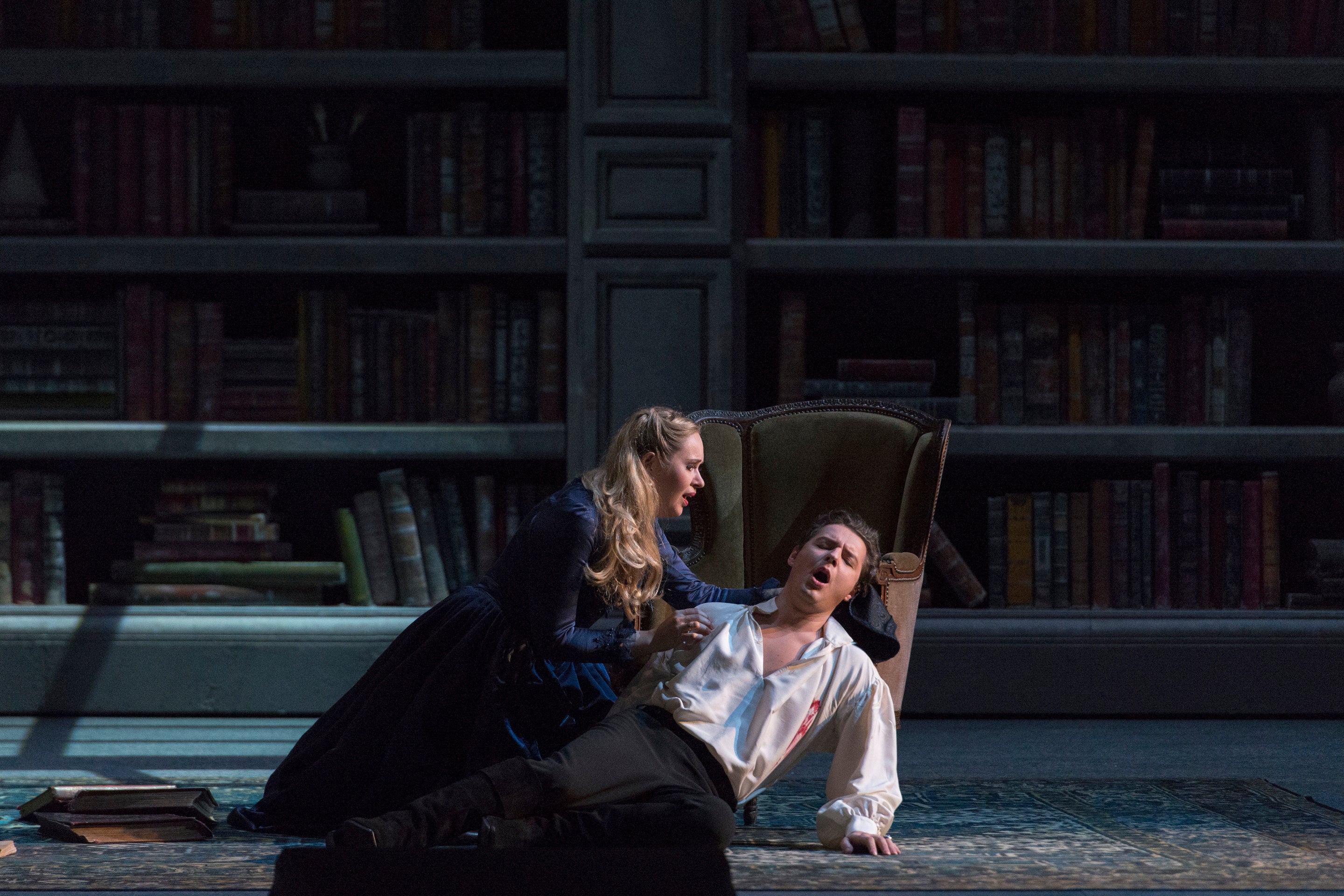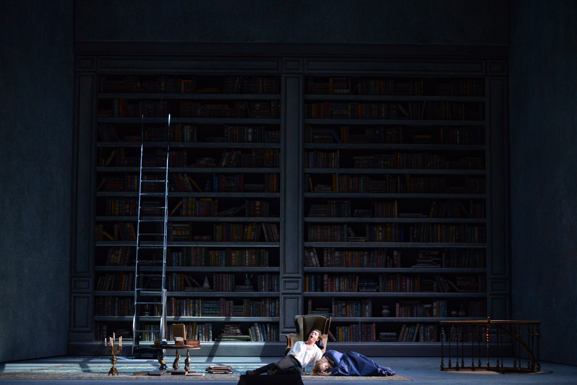 幕が進むにつれ、初夏から雪の舞うクリスマスへと季節の移ろいを描写すると共に、舞台は徐々に閉塞的になります。苦悩するシャルロットの息詰まるような部屋に続いて、最終幕では天井まで及ぶ書棚に覆われたウェルテルの書斎が彼の最期の場となります。