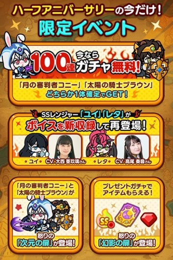 本イベントでは、新たに登場する記念キャラクターに初のボイスが実装されます。記念SSキャラクター「月の審判者コニー」には人気声優の竹達彩奈さんが担当するほか、SSレンジャー「ユイ」「レタ」もボイス付きで再登場します。その他にも100連無料ガチャや、豪華賞品が当たるプレゼントキャンペーンなど大盤振る舞いな「怒りのハーフアニバーサリー」を、ぜひお楽しみください。