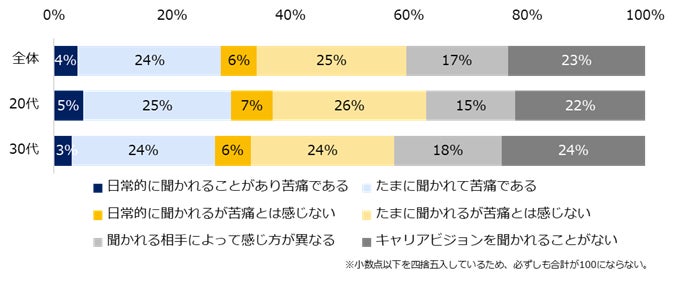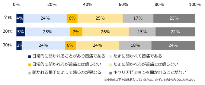 続けて、「上司や先輩からキャリアビジョン(仕事で実現したいことや将来のありたい姿)について聞かれて、苦痛に感じたことはありますか?」と伺うと、23%と約4人に1人は上司や先輩からキャリアビジョンを聞かれないことがわかりました。キャリアビジョンについて聞かれることをどのように感じるかの具体的なコメントも紹介します。