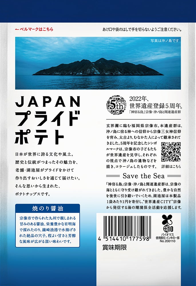 湖池屋では、2017年に世界遺産登録された「神宿る島」宗像・沖ノ島と関連遺産群を祝福・応援する意味を込めた商品「JAPANプライドポテト 九州焼のり醤油」を2018年に発売しました。2019年からは、宗像市が掲げる『海への感謝(Save the Sea)』をテーマとした商品を発売し、これまで「神宿る島」宗像・沖ノ島と関連遺産群を擁する宗像の海を守る活動を応援してきました。