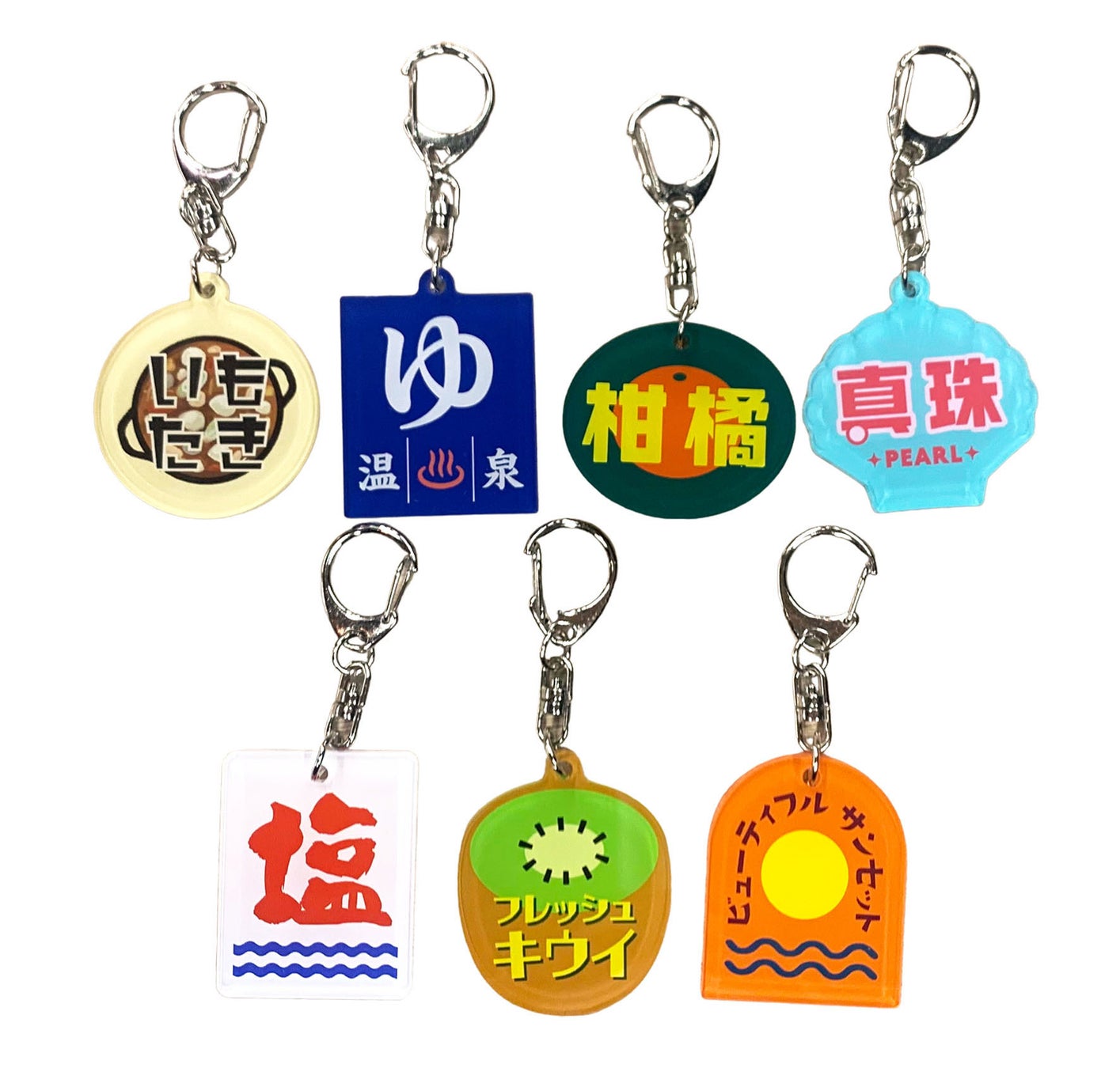 いもたき、温泉、真珠、柑橘、キウイなど愛媛の魅力が詰まったキーホルダー。