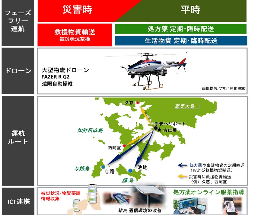 AIDは、離島の地理や輸送物資の特性に合わせ、航続距離・積載重量に優れる大型物流ドローンを使用し、JALよりドローン運航管理・安全管理などのノウハウ提供を受けながら、与路島・請島への災害時・平時にわたりフェーズフリーに対応する運航体制を構築しました。