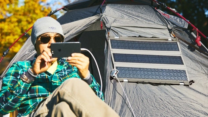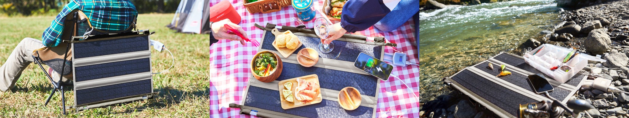 ◆天板に付いているループを活用したり、そのまま地面に広げたりと、様々な場面でソーラーパネルチャージャーとして活躍可能。