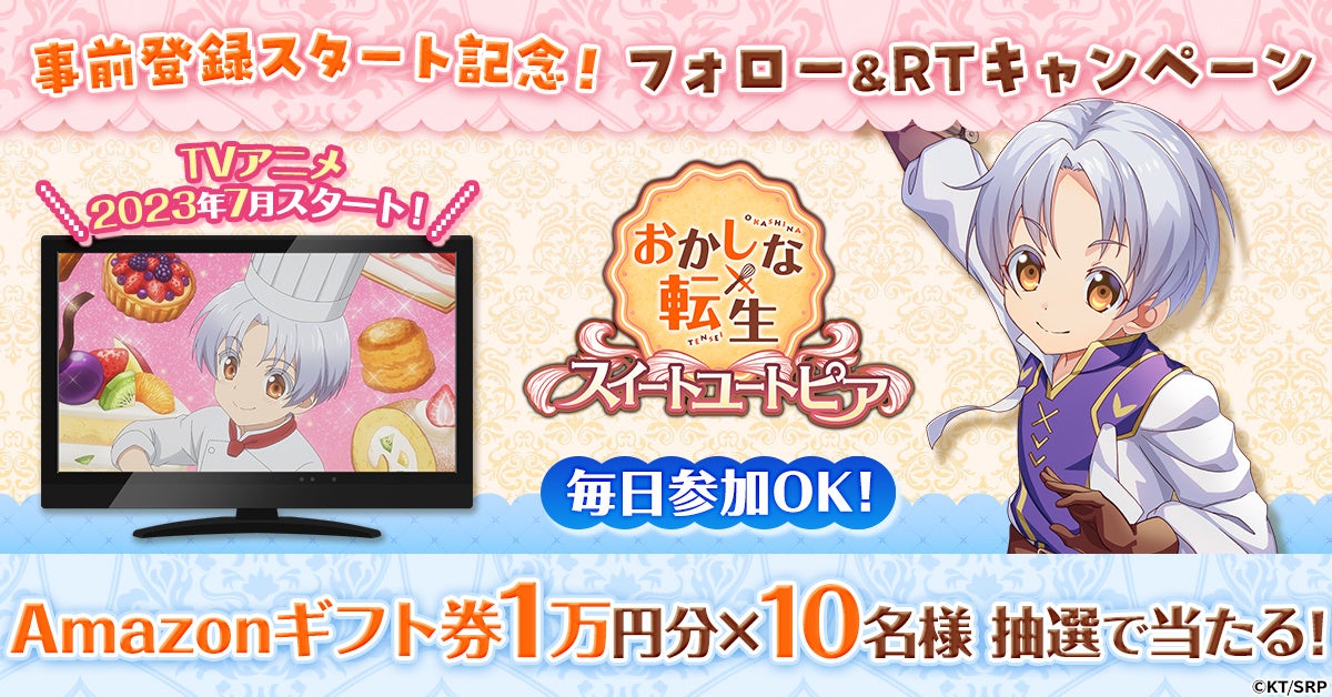 「おかしな転生 スイートユートピア」公式Twitterでは、事前登録開始を記念したフォロー&リツイートキャンペーンを実施中です。抽選で10名様にAmazonギフト券1万円分をプレゼントいたします。キャンペーンには毎日参加が可能で、以降も様々なキャンペーンを実施してまいりますので、ぜひ公式Twitterのフォローをお願いいたします。