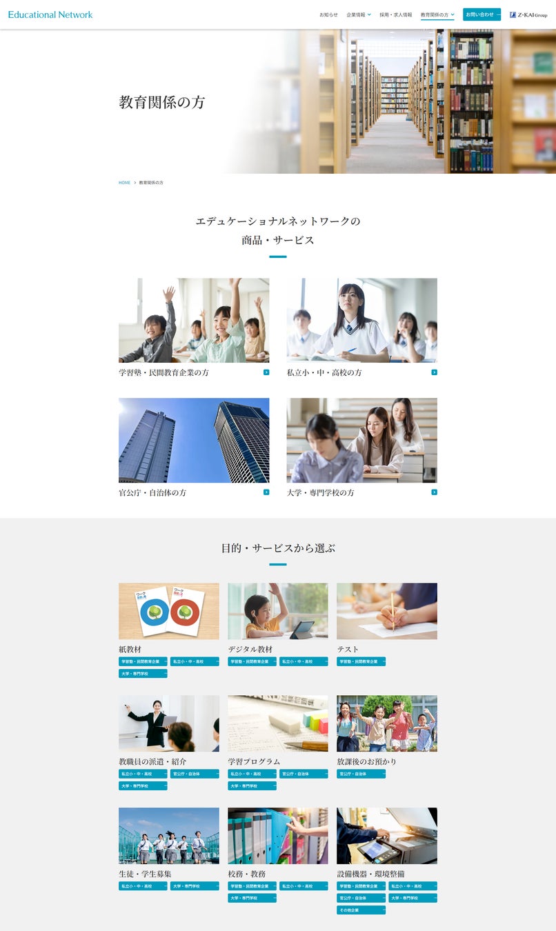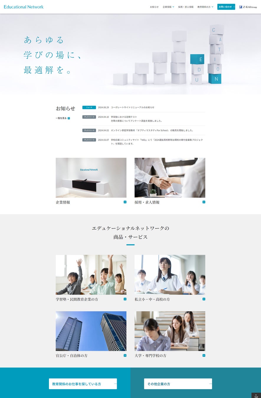 株式会社増進会ホールディングス(Z会グループ)のグループ会社で、教育機関の支援事業を行う株式会社エデュケーショナルネットワーク(本社:東京都千代田区、代表取締役社長:大久保忠志)は、2024年9月2日にコーポレートサイトの全面リニューアルを実施しました。