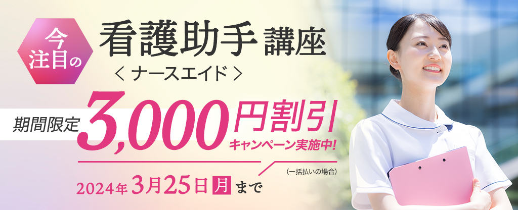 いま注目の「看護助手講座」(ナースエイド)が3,000円割引!2024年2月9日(金)より『割引キャンペーン』を開始!