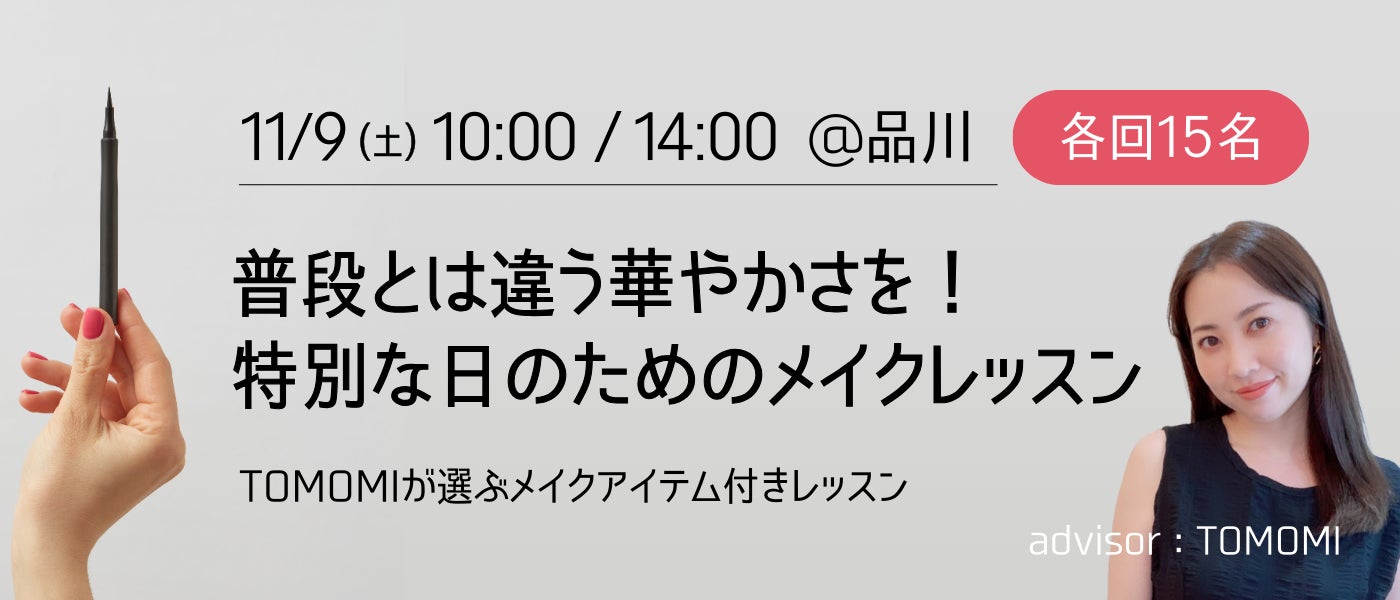年末年始に外出する機会も増え、普段とは違った華やかな印象のメイクに挑戦したい!しかし、どのようにメイクをしたら良いのか悩んでいる方も多いのではないでしょうか。本イベントでは、美容家・メイクアップインストラクターのTOMOMI氏が特別なイベントだけでなく、ちょっとしたお出かけにもぴったりなメイクをレクチャーします。華やかさを引き出す「アイライナーのセット」が付いており、ご自宅で使用しているアイテムを活用して華やかな印象になれるメイクアップ方法を学ぶことができるレッスンです。
