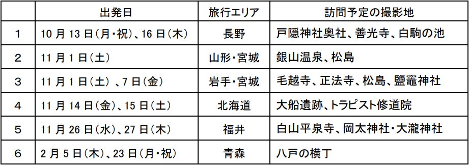 【内容】 上記のキャンペーンに合わせて、効率よくCM・ポスター撮影地を巡ることができる、1泊2日のコースを6コースご用意。大人の休日倶楽部会員の方は10,000円引きでご案内いたします。