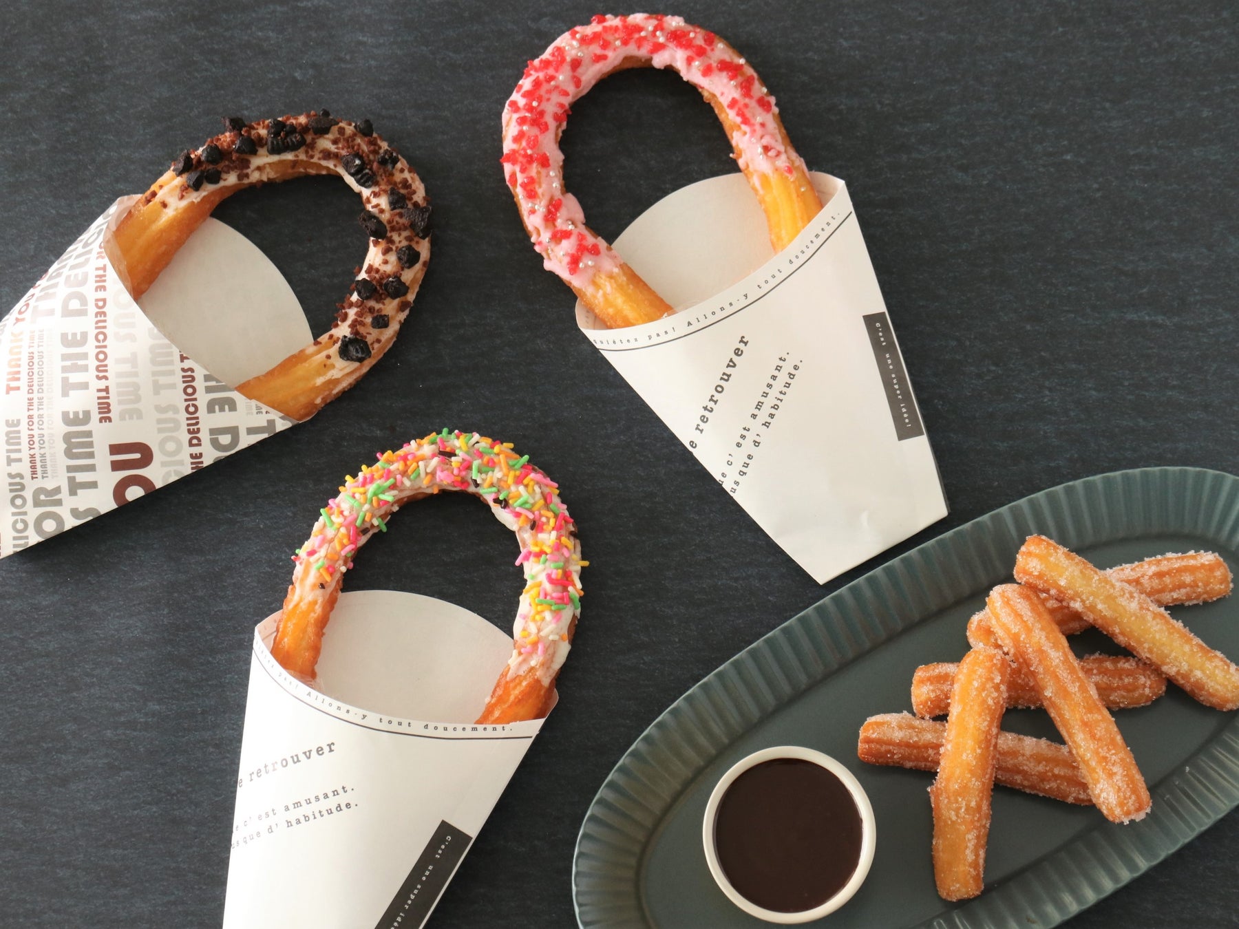 〇カラフルチュロス&熱々チョコレートソース(楕円 3コ、スティック 5~6本 持ち帰り)