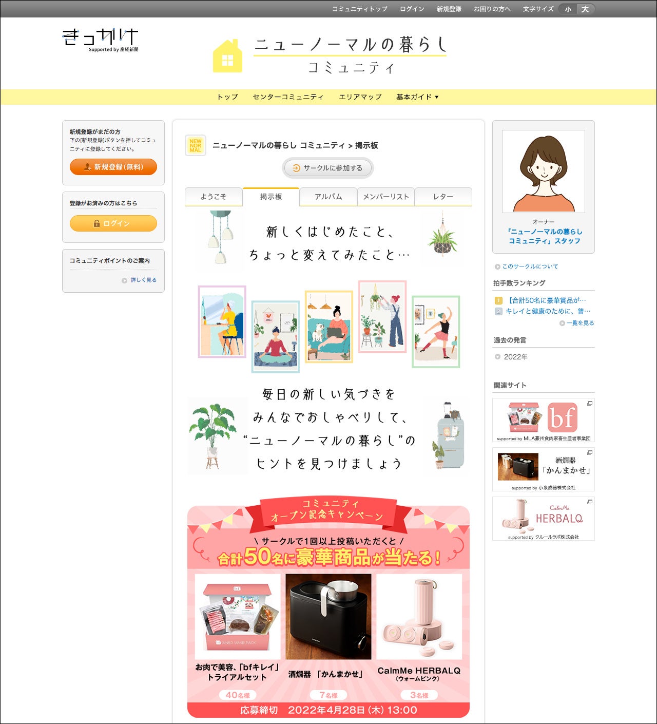 オープンを記念して、「ニューノーマルの暮らしコミュニティ」にご登録いただき、コミュニティ内でコメント投稿を行うなど、条件を満たした方を対象に、美容や健康に役立つ豪華賞品が50名様に当たるキャンペーンを実施します。締め切りは2022年4月28日13時。コミュニティへの登録、参加は無料です。