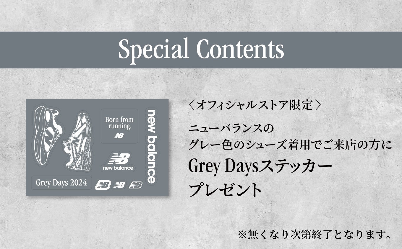 オフィシャストア各店へ、ニューバランスの“グレー”のシューズを着用してご来店の方に、Grey Daysステッカーをプレゼントいたします。店内にてストアスタッフにお声がけください。