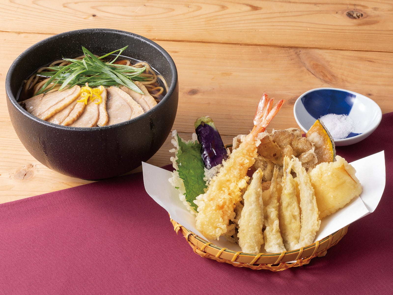 第二弾のセットには、冬の訪れを感じさせる「ワカサギ」などを盛り合わせた天ぷらをご用意しました。揚げたてサクサクの衣に包まれた淡泊で上品な味わいのワカサギをこだわりの鴨南蛮そばとセットでご提供いたします。