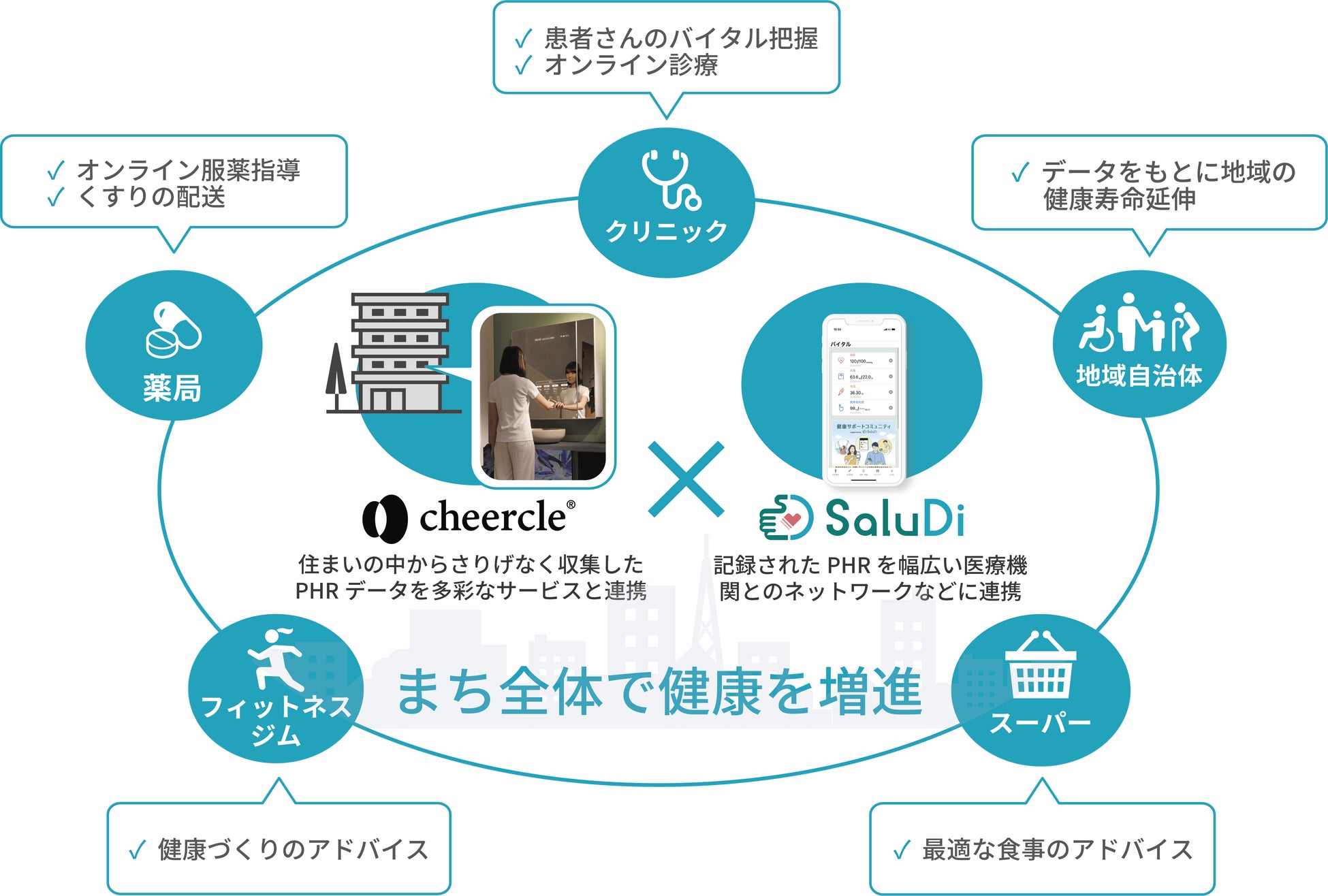 凸版印刷は、住まいの中からさりげなく居住者の体重変化や体組成などのPHR(Personal Health Record)データを収集する「cheercle®」を販売しています。沢井製薬は、PHRデータを管理、本人同意のもとで医療従事者と共有、治療や服薬指導にも活用できるPHR管理アプリ「SaluDi」を展開しています。この二つのサービスを連携することで、居住者の健康情報を確認しながら質の高い医療の提供や、生活者や地域の医療・ヘルスケアサービスの向上が可能となります。