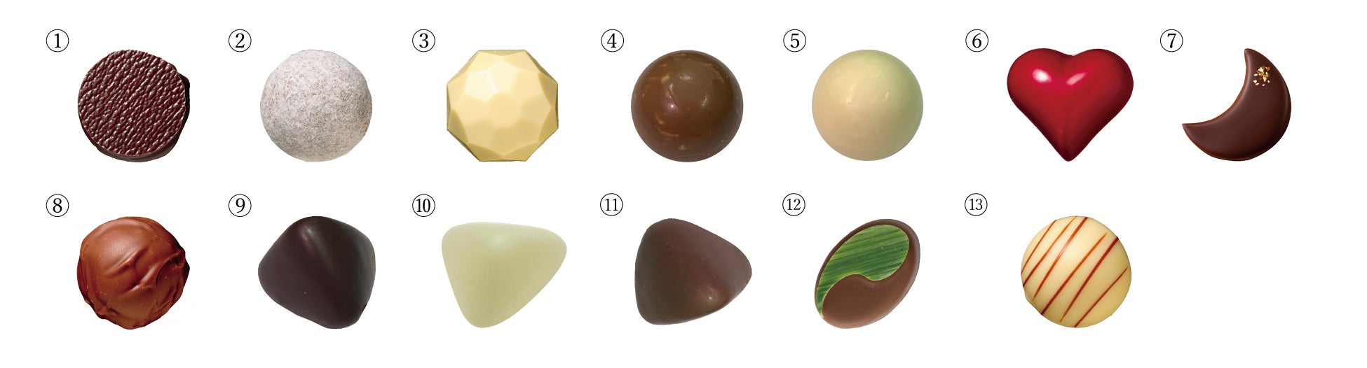 ⑩ ゼリーマスカット:さわやかなマスカットゼリーにホワイトチョコレートをコーティング。