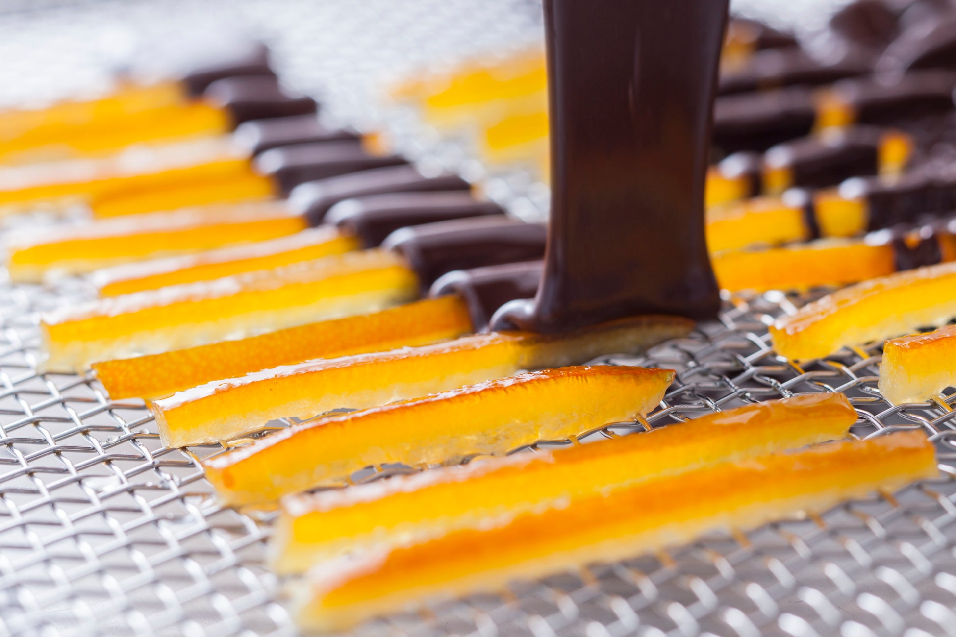 フランスのサバトン社が独自のノウハウをいかし、煮込み・シロップ漬けをして濃縮されたオレンジピールは、キラキラとした照りをまとい指の腹でつまんでもちぎれてしまうほど柔らかいものです。それを細く棒状にし、チョコレートがけする作業は困難を極めます。しかし、それがあのゼリーともジャムともつかないほど柔らかなオレンジピールの美味しさ、渋みや雑味のない味わいの秘密です。