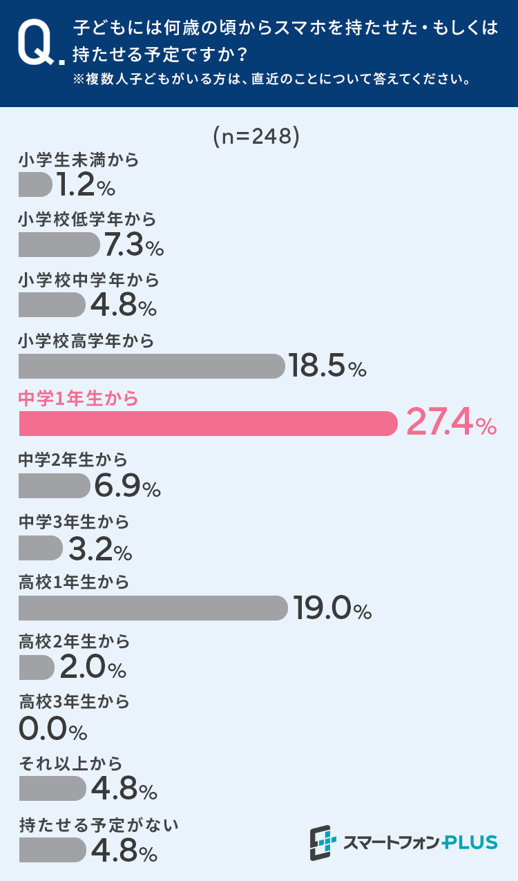 27.4%の方が「中学1年生からスマートフォンを持たせた」もしくは「持たせる予定」と回答しています。