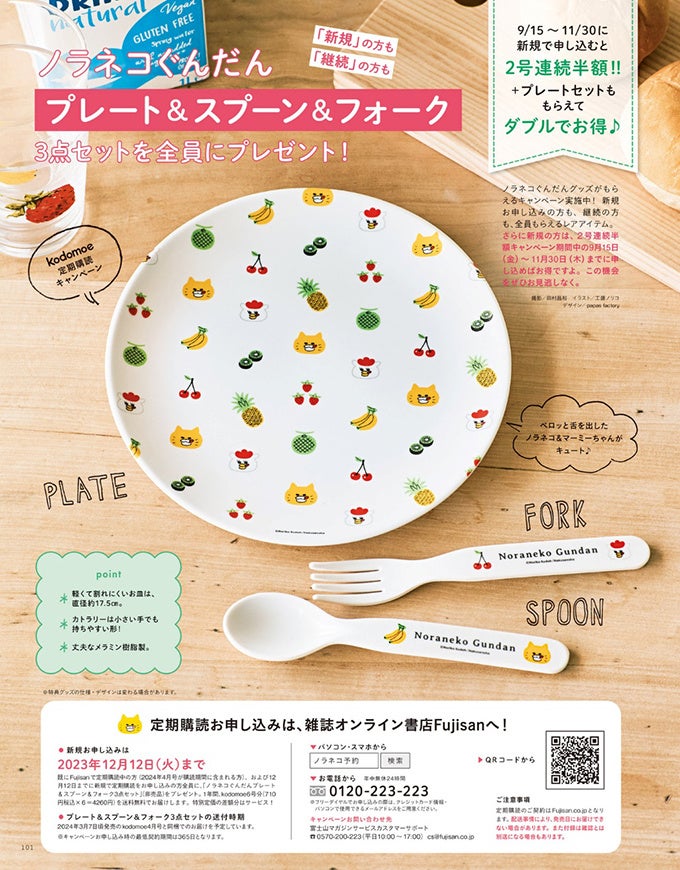 新規お申し込みの方も、すでに定期購読中の方(2024年4月号が購読期間に含まれる方)も、全員もれなく特典グッズがもらえる恒例キャンペーン実施中! 今回の特典は、ノラネコぐんだんプレート&スプーン&フォークの3点セット! ここでしか手に入らないレアアイテムです! 新規の方は、2号連続半額キャンペーン実施中の9月15日(金)以降に申し込むと、さらにお得です!(半額キャンペーンは11月30日(水)まで実施。)