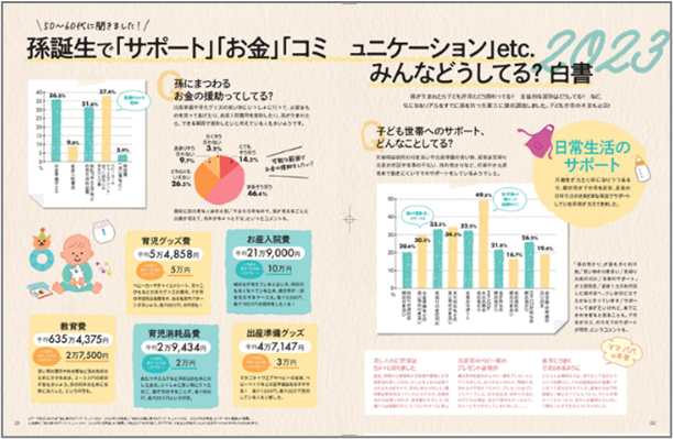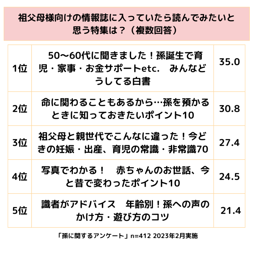 祖父母向けの情報誌に入っていたら読みたい特集のアンケート結果でも、祖父母が孫誕生にあたり知りたい情報として、育児・家事・お金サポートの実態や、最新の育児情報などがランクインし、祖父母世代も孫育児について情報を得たい、学びたいというニーズがあることが分かりました。